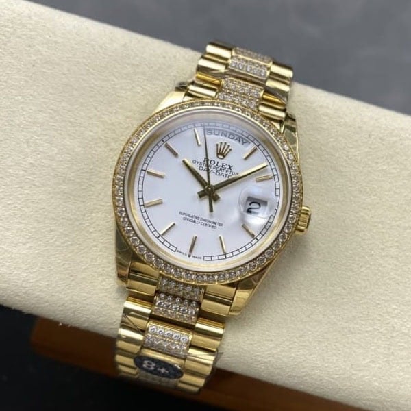ベゼル:人工ダイヤがすべて埋め込み手作業入り!フルーテッドベゼルは18kゴールドコーティングを施された904Lステンレススチールで作り出されており、