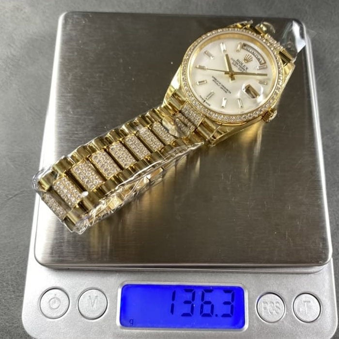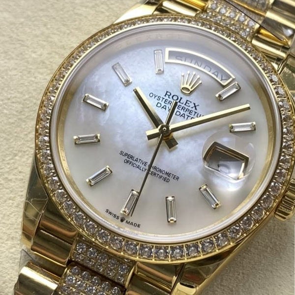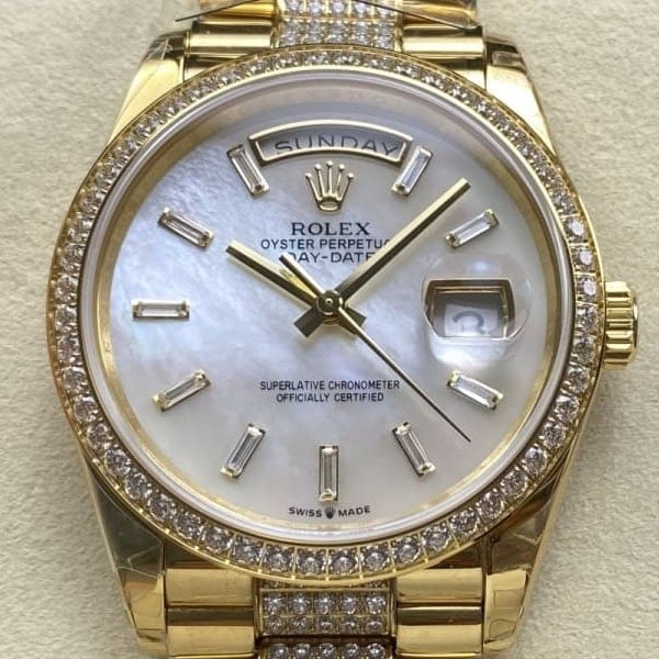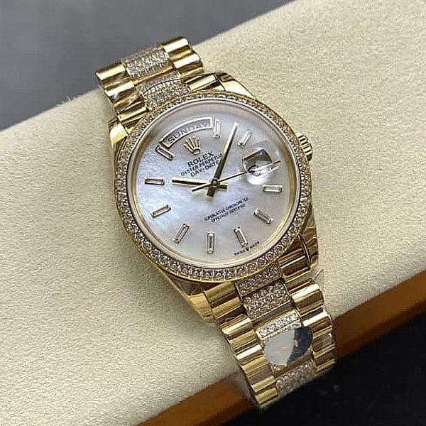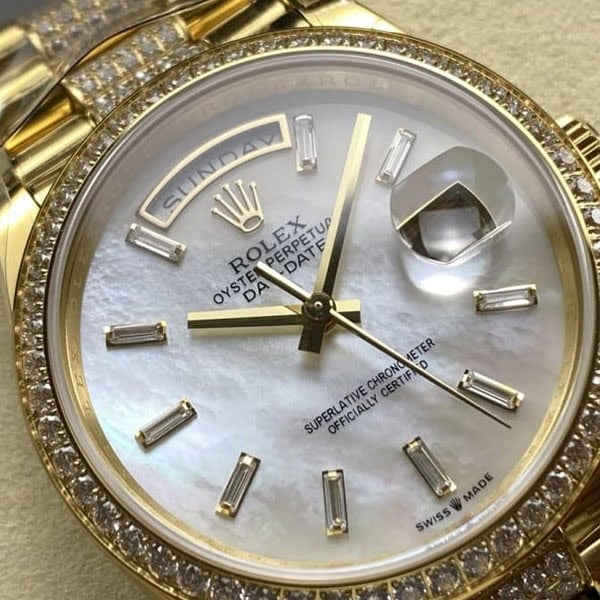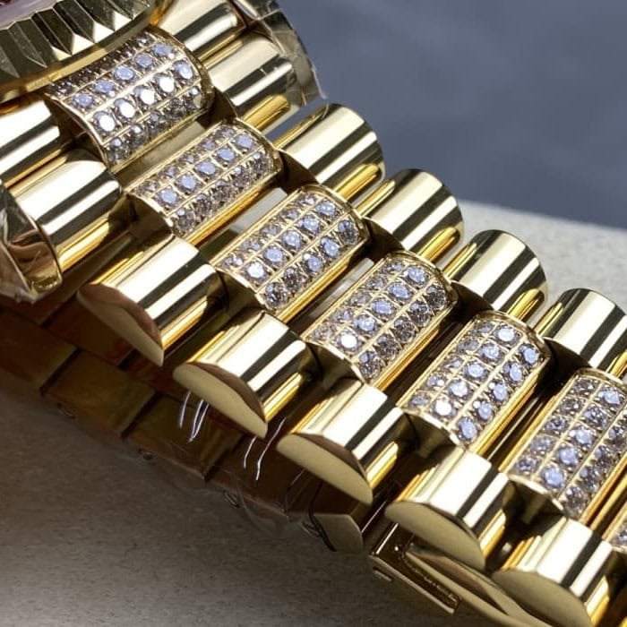 文字盤:シェル文字盤に人工ダイヤがすべて埋め込み手作業入り!レーザーで精密に作られたテキスト、印刷、彫刻が施された文字盤は、本物のロレックスのものと見分けがつきません。