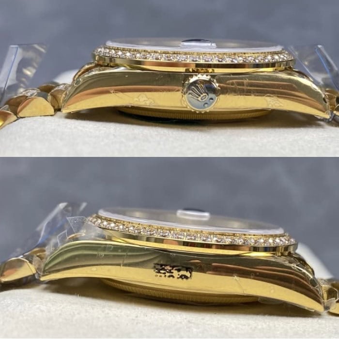 ケース:36mmのオイスターケースはロレックスのオイスタースチールにマッチし、ソリッドな904Lステンレススチールのモノブロック構造の上に18kゴールドコーティングを施された