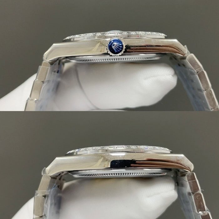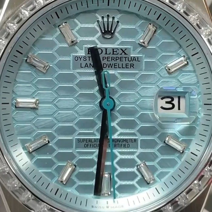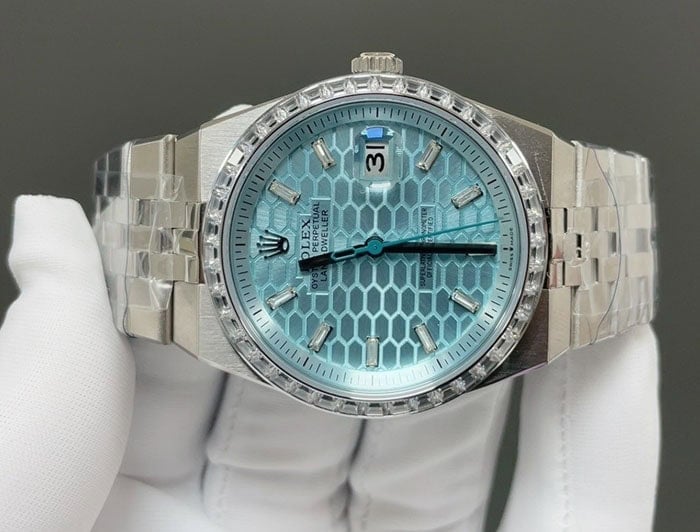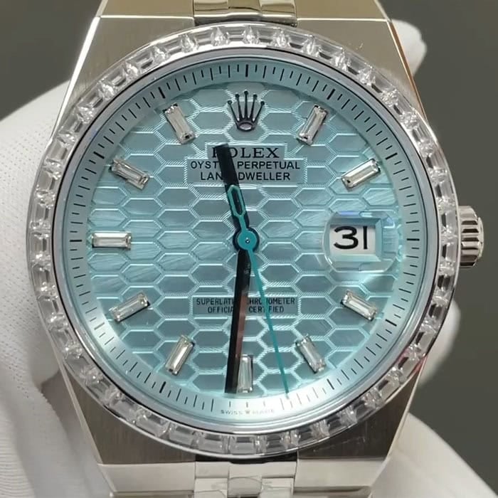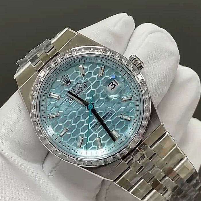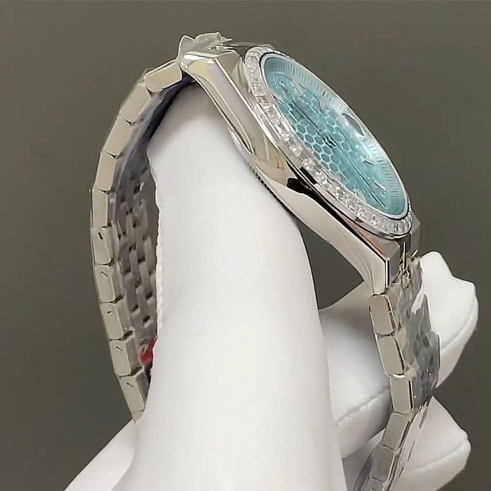 文字盤に関してはアイスブルーハニカムモチーフでゴージャスにダイヤモンドを装飾した、美しく爽やかで貴重な逸品でございます。