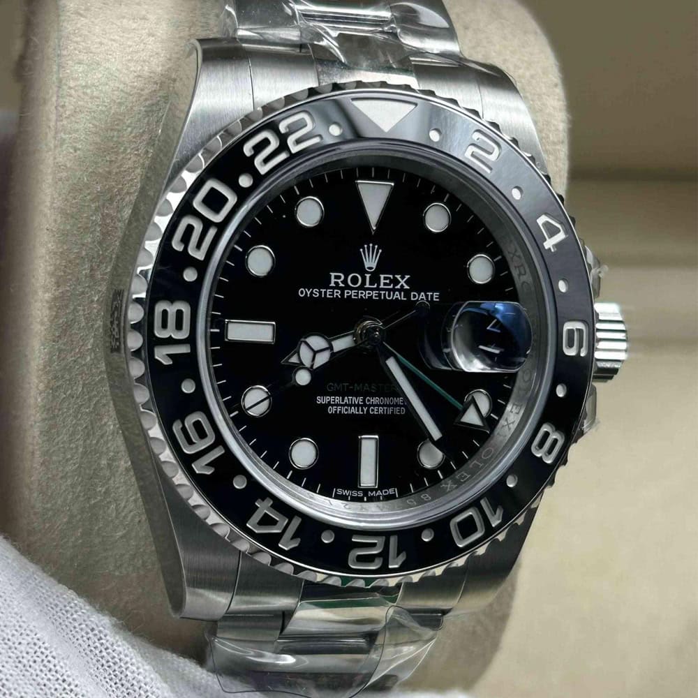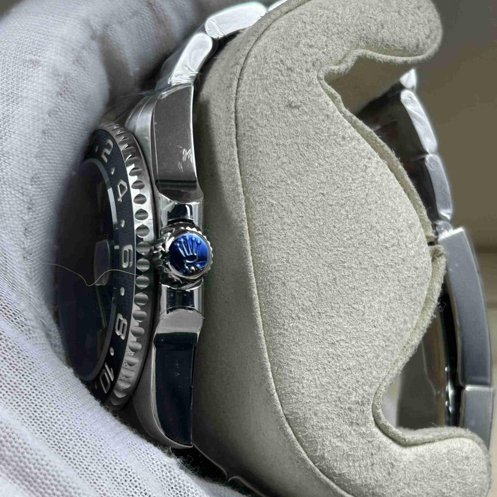 ムーブメント:ロレックス3186クローンムーブメントを搭載されており、GMT24時間針により、第2時間帯を表示できます。正しいシリアル番号と内側と外側の同一のマーキングが刻まれています。耐磁性ブルーヘアスプリング(Parachrom)とGlucydur耐磁性金メッキテンプが精度を確保できます。すべての部品は正規品と交換できます。パーペチュアルローターにより、オートマチック機械式両方向自動巻きを実現しています。スムーズなスイープ秒針は28,800VPH(4Hz)で作動し、31石(レッドルビー)が使用されています。精度はCOSC認定の範囲内で、(-4/+6秒/日)以内に抑えられており、パワーリザーブはほぼ48時間に達します。