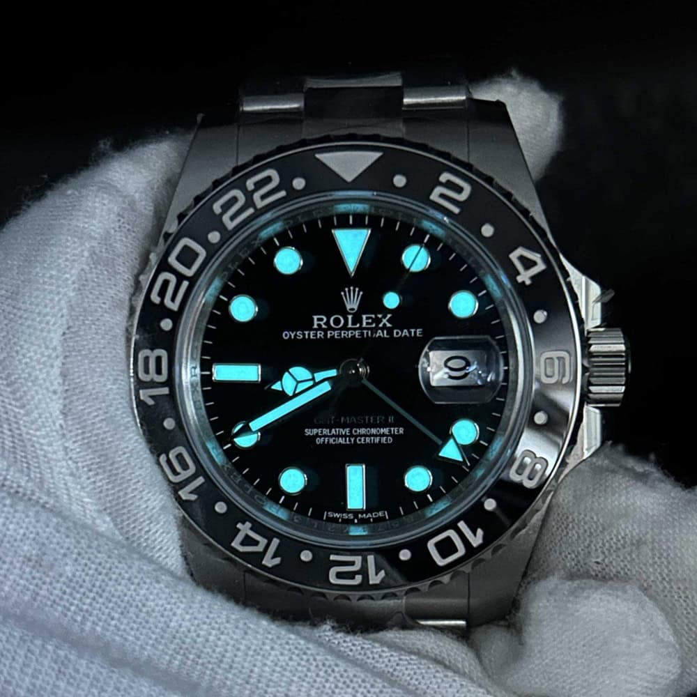 文字盤:ブラック文字盤には明るい夜光スーパールミノバ ブルー発光蓄光でコーティングされたアワーマーカーと針を取り付けられており、優れた視認性を確保しています。暗闇に9時間まで均一的に発光できます。レザーによる高精度のテキスト、フォント、刻印、正確なデイトフォントとサイズに至るまで、完璧にロレックス正規品を再現しています。特徴的なグリーンGMT の矢印の付いた針は24時間ごとに1回を回転します。アワーマーカーと針に18kゴールドコーティングを施されており、色落ちしないことを確保しています。
