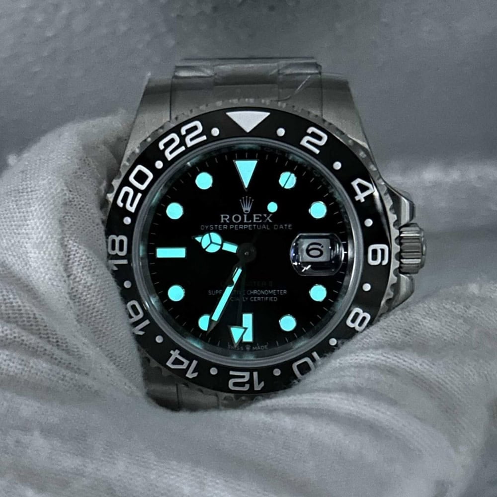 文字盤:ブラック文字盤には明るい夜光スーパールミノバ ブルー発光蓄光でコーティングされたアワーマーカーと針を取り付けられており、優れた視認性を確保しています。暗闇に9時間まで均一的に発光できます。レザーによる高精度のテキスト、フォント、刻印、正確なデイトフォントとサイズに至るまで、完璧にロレックス正規品を再現しています。特徴的なグリーン GMT の矢印の付いた針は24時間ごとに1回を回転します。アワーマーカーと針に18kホワイトゴールドコーティングを施されており、色落ちしないことを確保しています。