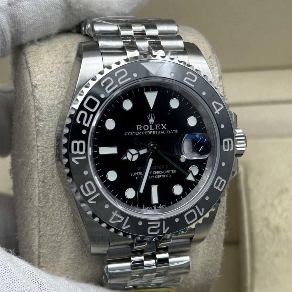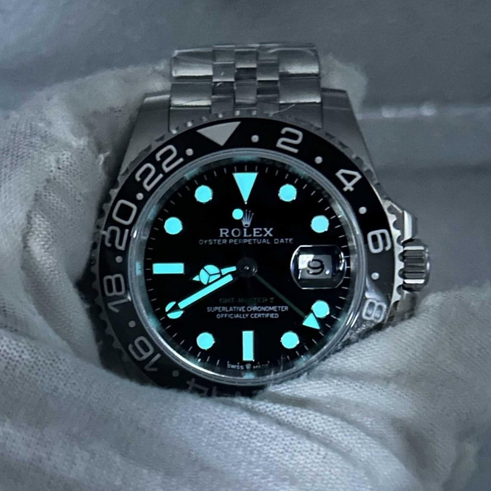 文字盤:ブラック文字盤には明るい夜光スーパールミノバ ブルー発光蓄光でコーティングされたアワーマーカーと針を取り付けられており、優れた視認性を確保しています。暗闇に9時間まで均一的に発光できます。レザーによる高精度のテキスト、フォント、刻印、正確なデイトフォントとサイズに至るまで、完璧にロレックス正規品を再現しています。特徴的なグリーン GMT の矢印の付いた針は24時間ごとに1回を回転します。アワーマーカーと針に18kホワイトゴールドコーティングを施されており、色落ちしないことを確保しています。