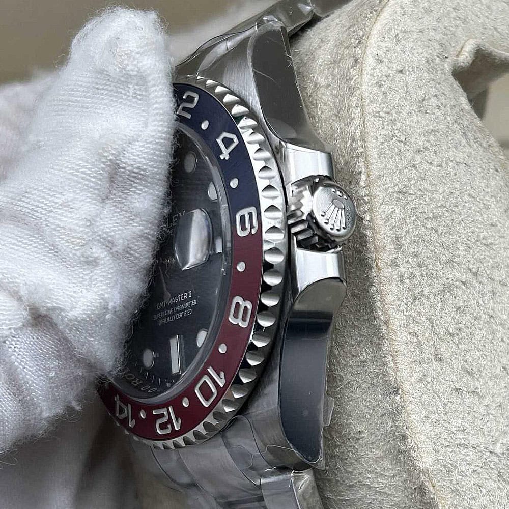 ベゼル:24 クリックで双方向に回転できる24時間両回転ベゼルを備えており、計時の正確性を確保します。耐傷性ある青と赤の2色(ペプシーとも言う)セラクロム セラミック インサートに刻まれた数字と目盛りは本物のプラチナでコーティングされており、時計に高級感を加えます。
