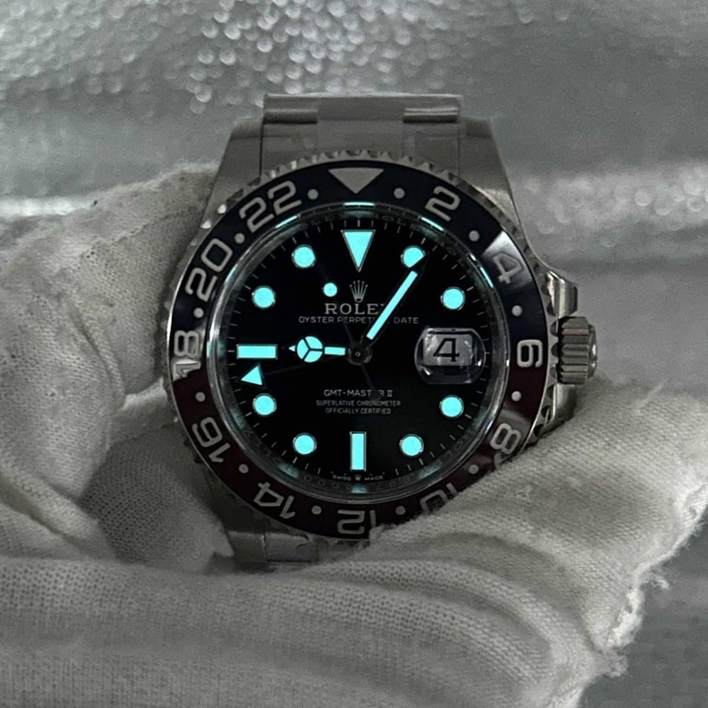 文字盤:鮮やかなブルーの文字盤には明るい夜光スーパールミノバ ブルー発光蓄光でコーティングされたアワーマーカーと針を取り付けられており、優れた視認性を確保しています。暗闇に9時間まで均一的に発光できます。レザーによる高精度のテキスト、フォント、刻印、正確なデイトフォントとサイズに至るまで、完璧にロレックス正規品を再現しています。特徴的な赤い GMTの矢印の付いた針は24時間ごとに1回を回転します。アワーマーカーと針に18kホワイトゴールドコーティングを施されており、色落ちしないことを確保しています。