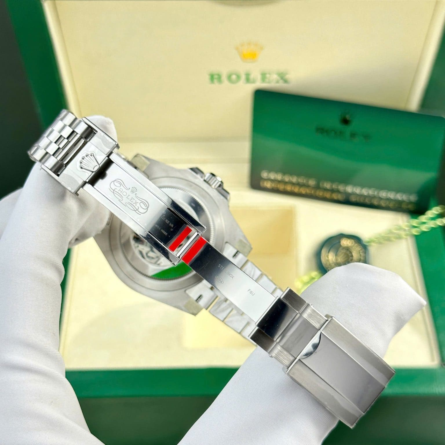 文字盤:ブラック文字盤には明るい夜光スーパールミノバ ブルー発光蓄光でコーティングされたアワーマーカーと針を取り付けられており、優れた視認性を確保しています。暗闇に9時間まで均一的に発光できます。レザーによる高精度のテキスト、フォント、刻印、正確なデイトフォントとサイズに至るまで、完璧にロレックス正規品を再現しています。特徴的なグリーン GMT の矢印の付いた針は24時間ごとに1回を回転します。アワーマーカーと針に18kホワイトゴールドコーティングを施されており、色落ちしないことを確保しています。