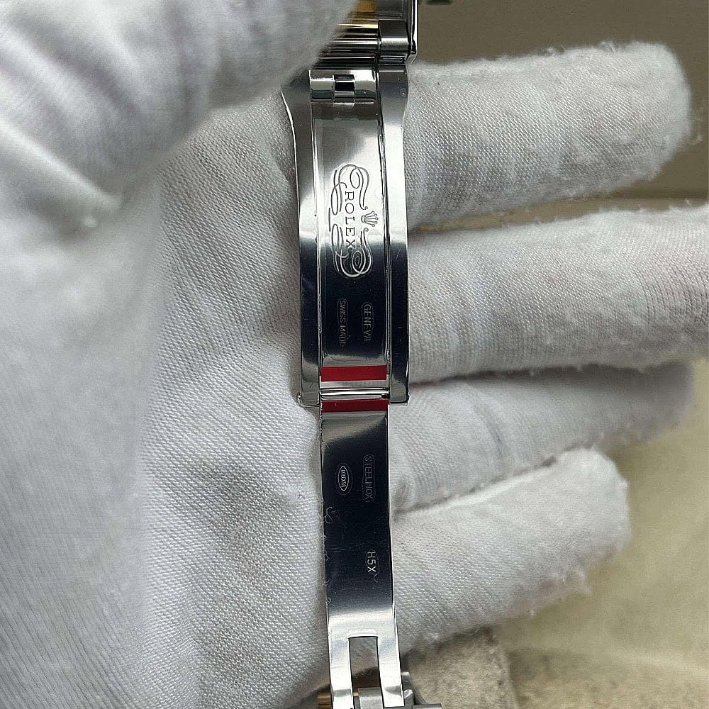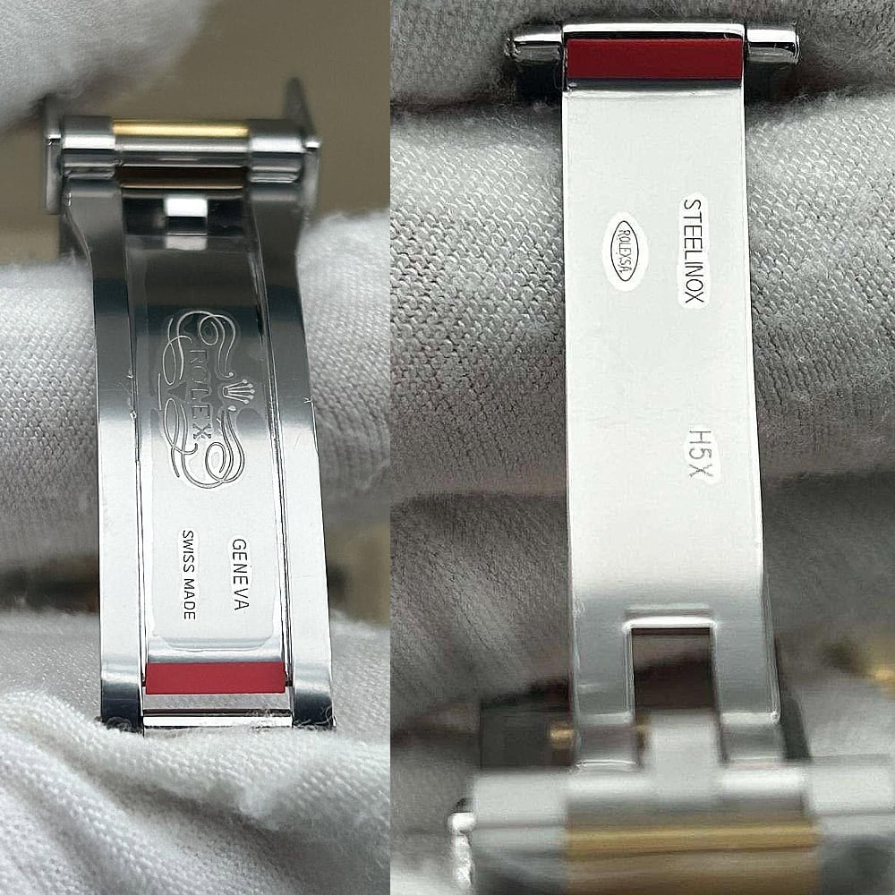 ベルト:オイスター デザインとフラット 3 ピース リンクのブレスレットは18Kイエローゴールドコーティングされたソリッド904Lステンレススチールで作り出されており、DLCスクラッチプロティングコーティングも施されています。しっかりとしたネジ山により、楽にベルト調整を実現し、5ミリをコンフォートエクステンションリンク(イージリンクとも言う)を備えた折りたたみ式オイスターロック安全クラスプも備えています。