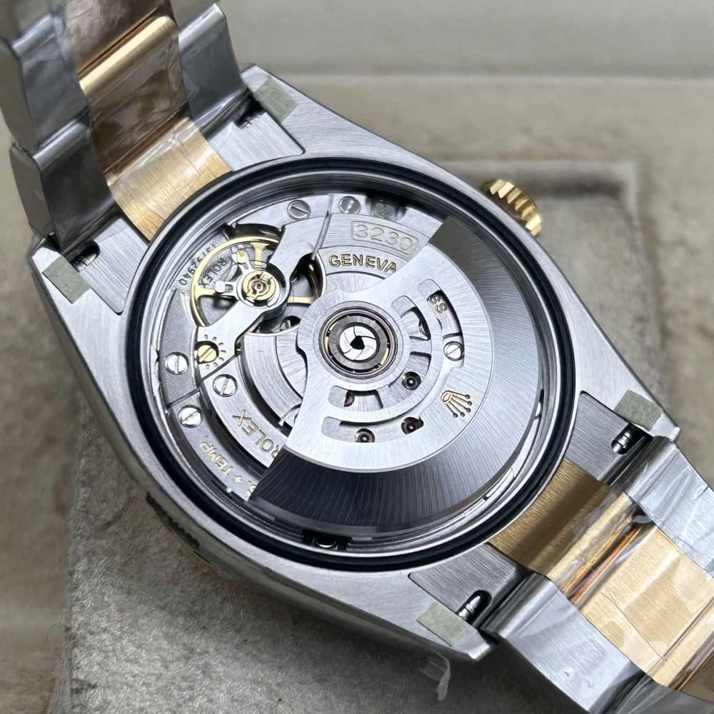 ムーブメント:常磁性青色合金パラクロム ヘアスプリングと高性能パラフレックス ショックアブソーバーを備えたクローン ロレックス 3230 スイス製ムーブメントが搭載されています。正しいシリアル番号と内側と外側の同一のマーキングが含まれており、オリジナルと見分けがつかないです。ムーブメントすべての部品は正規品と交換可能です。パーペチュアル ローターにより、自動機械式双方向自動巻きを実現しています。スムーズなスイープ秒針は 28,800 VPH (4Hz) で動作し、精度は (-4/+6 秒/日) 以内で、COSC 認証制限内に十分に収まり、パワーリザーブは約70時間に達します。