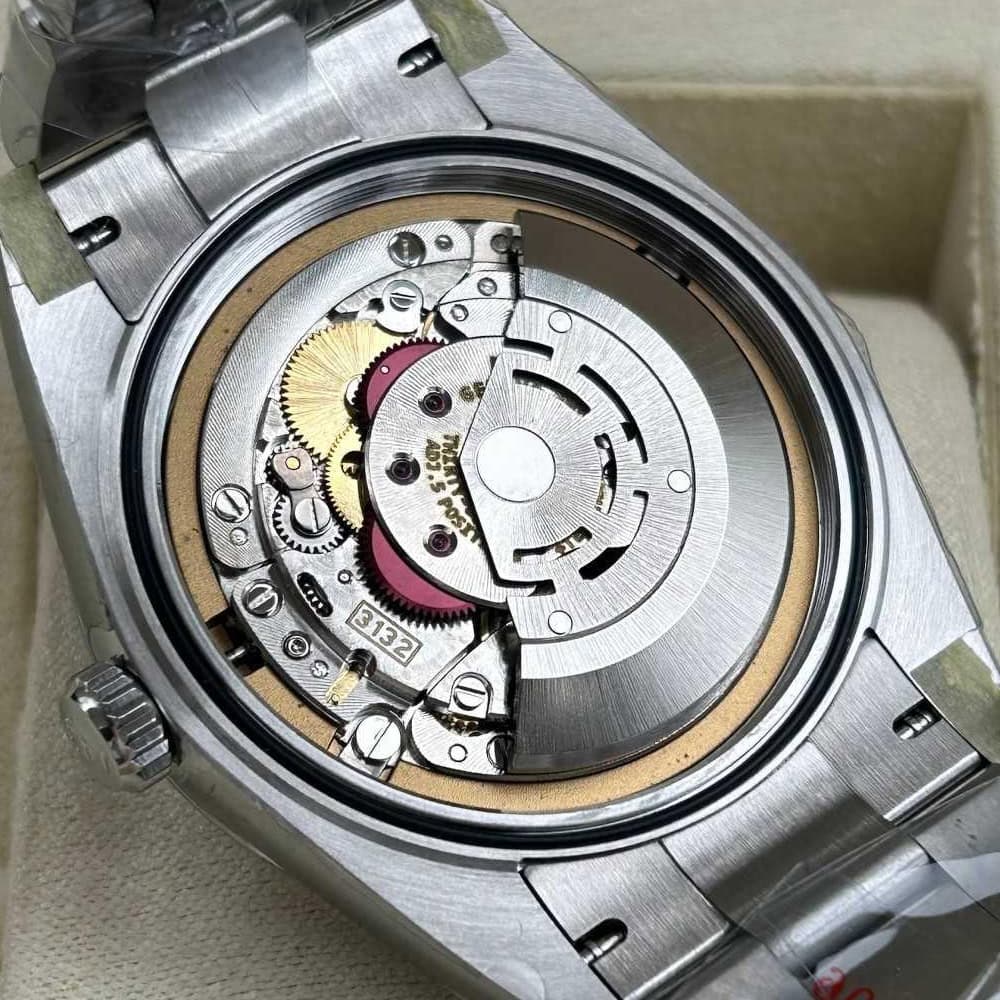 ムーブメント:このモデルにはスイス製ロレックスクローン3132ムーブメントを搭載されており、正しいシリアル番号と内側と外側の同一なマーキングが正規品とそっくりです。振動子には耐磁性ブルー ヘアスプリングとGlucydur金メッキ耐磁性テンプを搭載しています。すべてのムーブメント部品は正規品と互換性があります。パーペチュアルローターによるオートマチック機械式両方向自動巻きを実現しています。滑らかに作動している秒針は28,800VPH(4Hz)で作動し、25石(レッドルビー)が使用されています。
