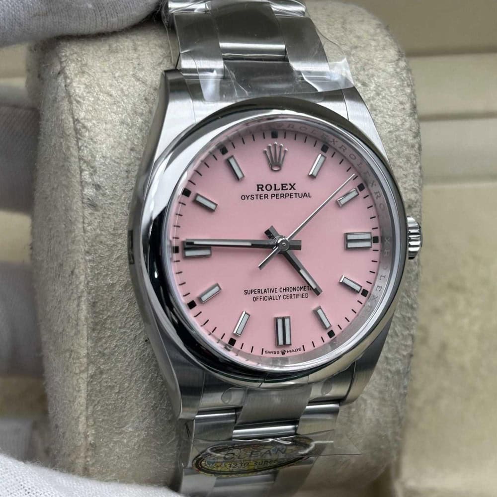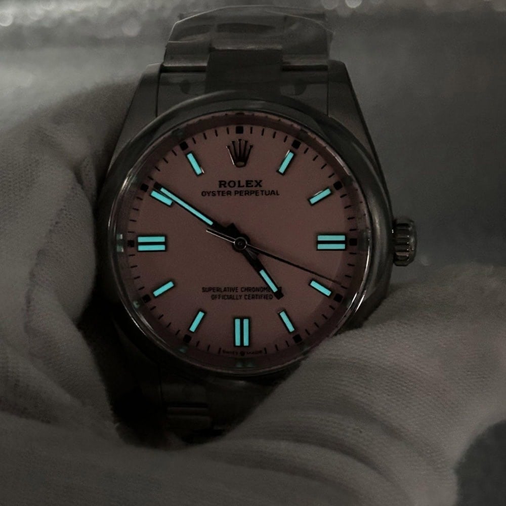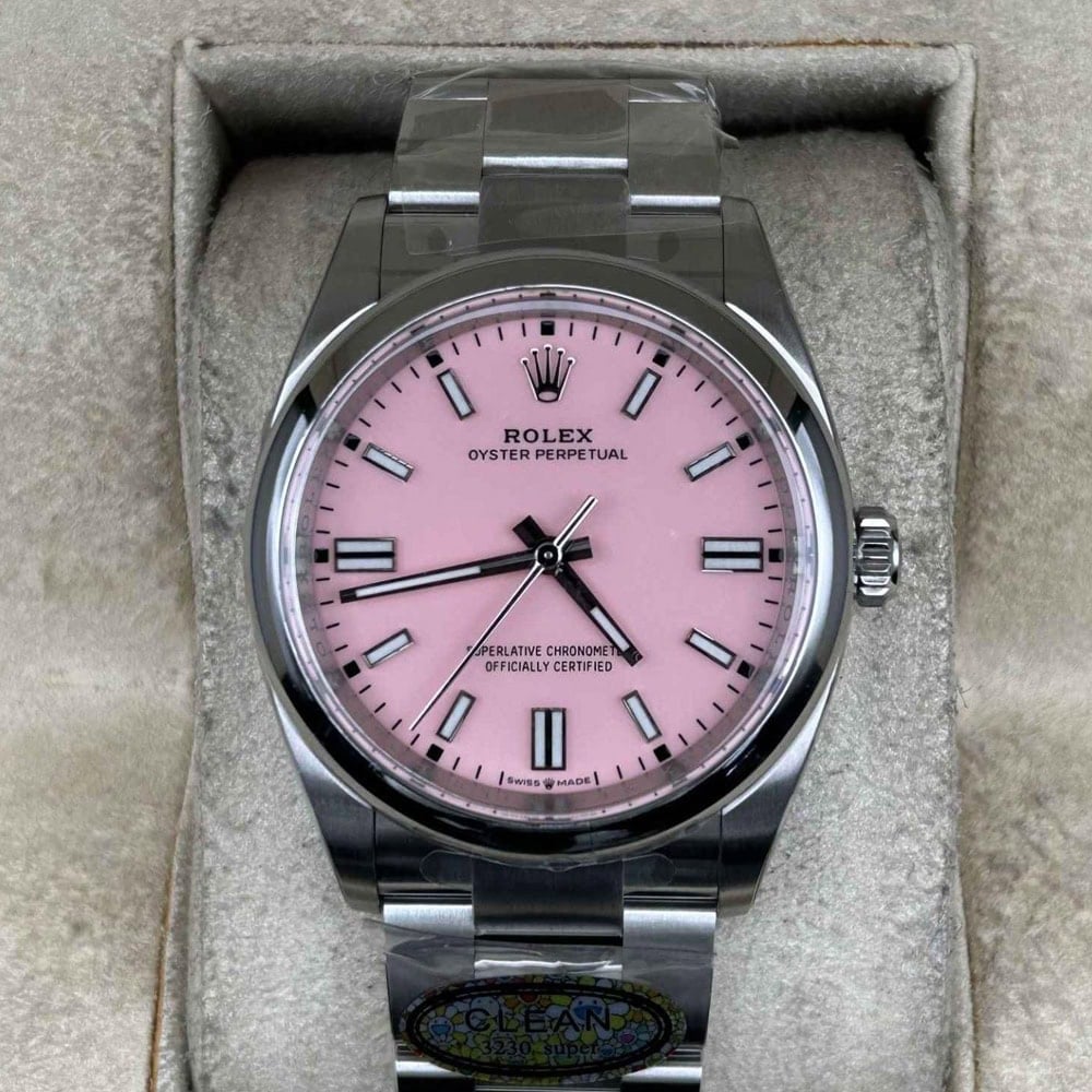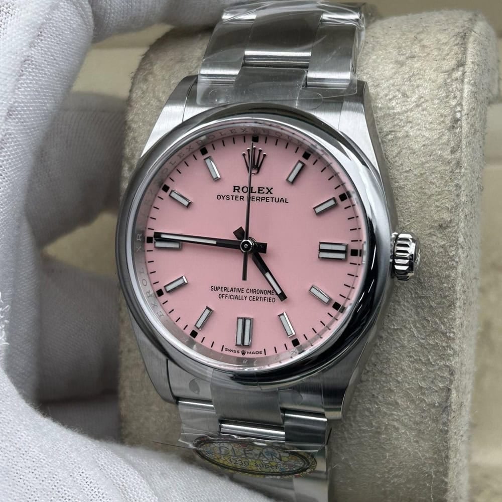 ケース:36ミリオイスターケースを備えており、この時計はモノブロック構造の904Lステンレススチールによって作り出されています。この904Lグレードのスチールは、ロレックスの「オイスタースチール」ステンレススチールウォッチに採用されているものと同じもので、錆びにくいことで知られています。この時計はねじ込み式ケースバックと巻上げニューズを備えたため、時計の防水性を確保しています。RehautリンクにはROLEX ROLEX刻印を刻まれており、正しいアライメントを保証しています。寸法と重さも正規品と一致しており、正規品と1:1でマッチングすることを実現しています。