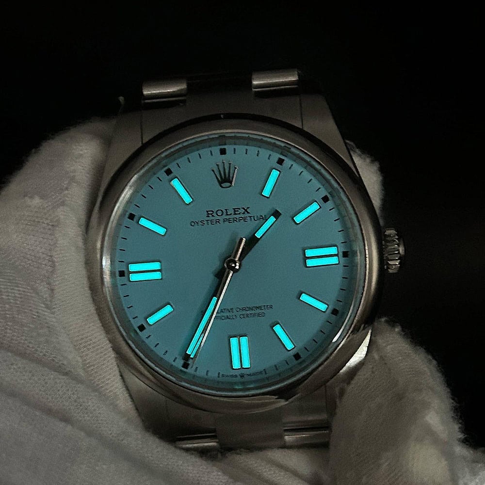 文字盤:クリーンファクトリーはティファニーターコイズ ブルー文字盤をリリースしました。アワーマーカーと針は明るいスーパールミノバブルールミネッセンス蓄光夜光でコーティングされており、夜間に最大4?6時間均一に明るく発光できます。Chromalight ディスプレイのフォント サイズと視認性は 1:1 で正確に再現されています。