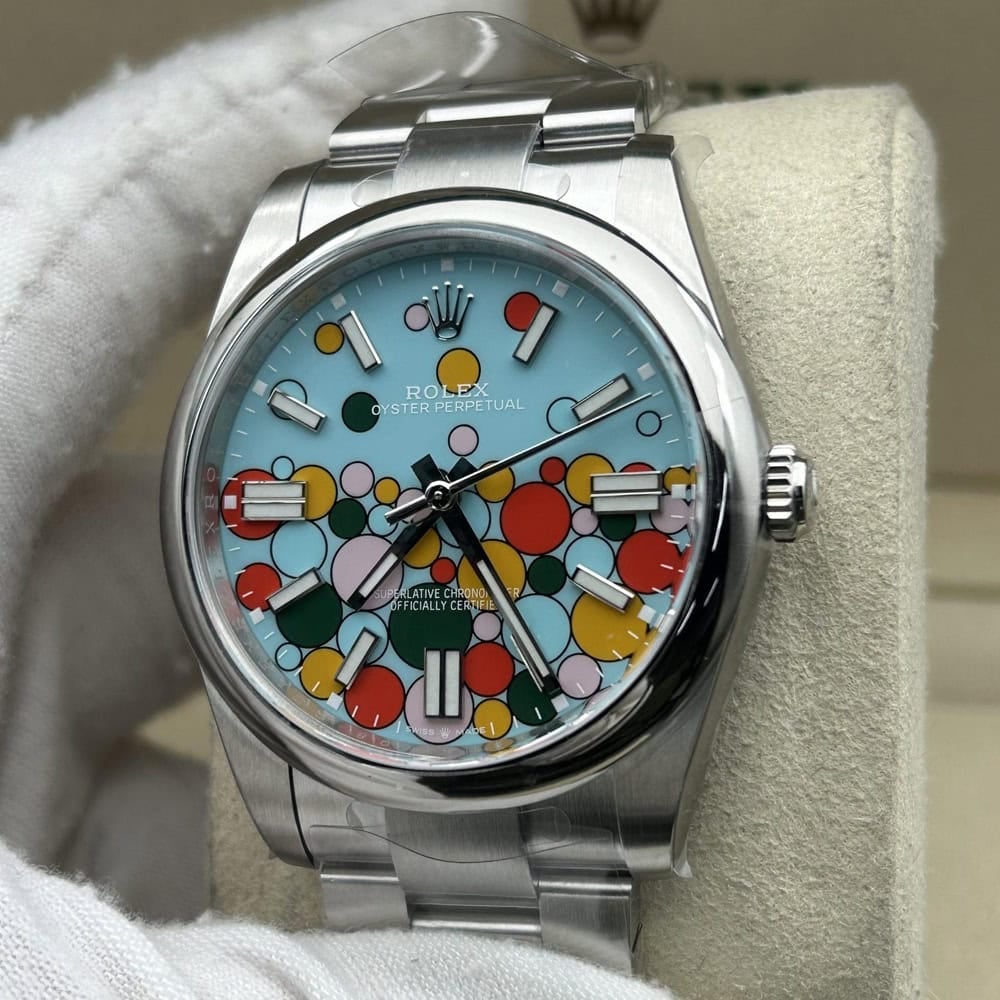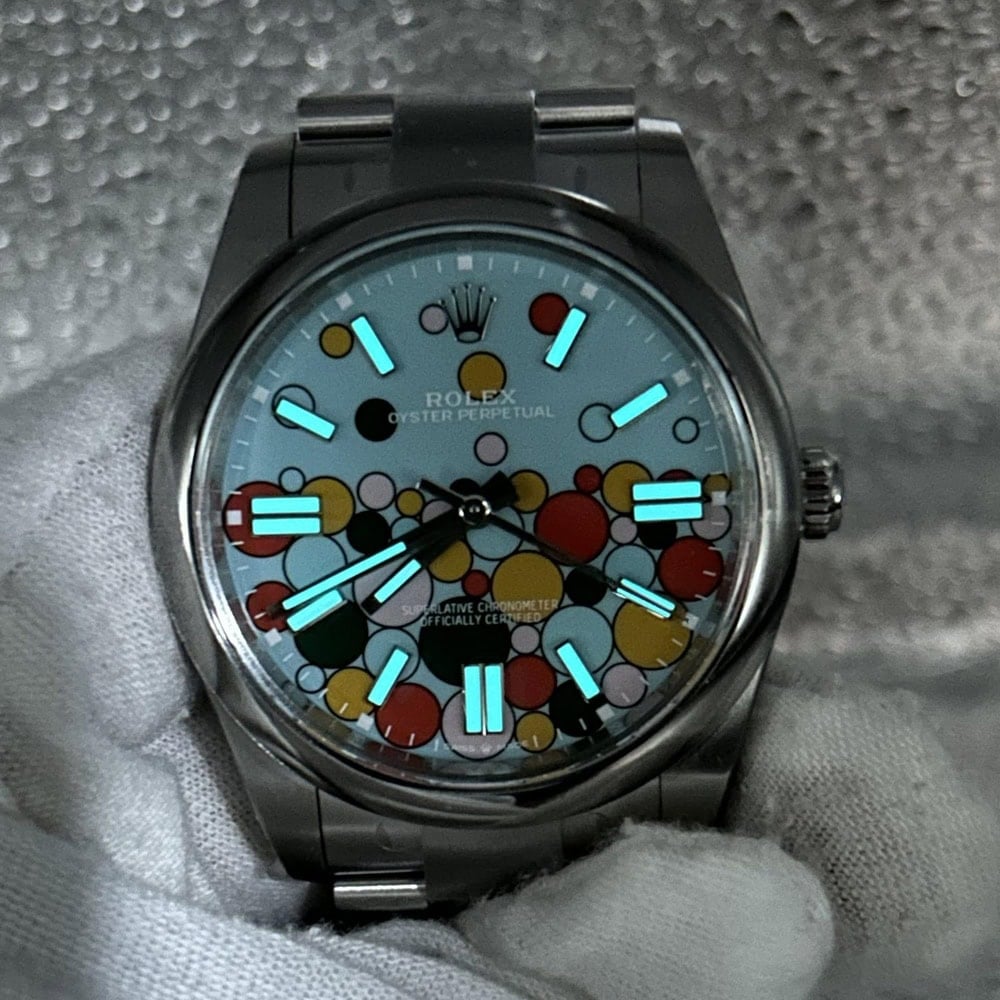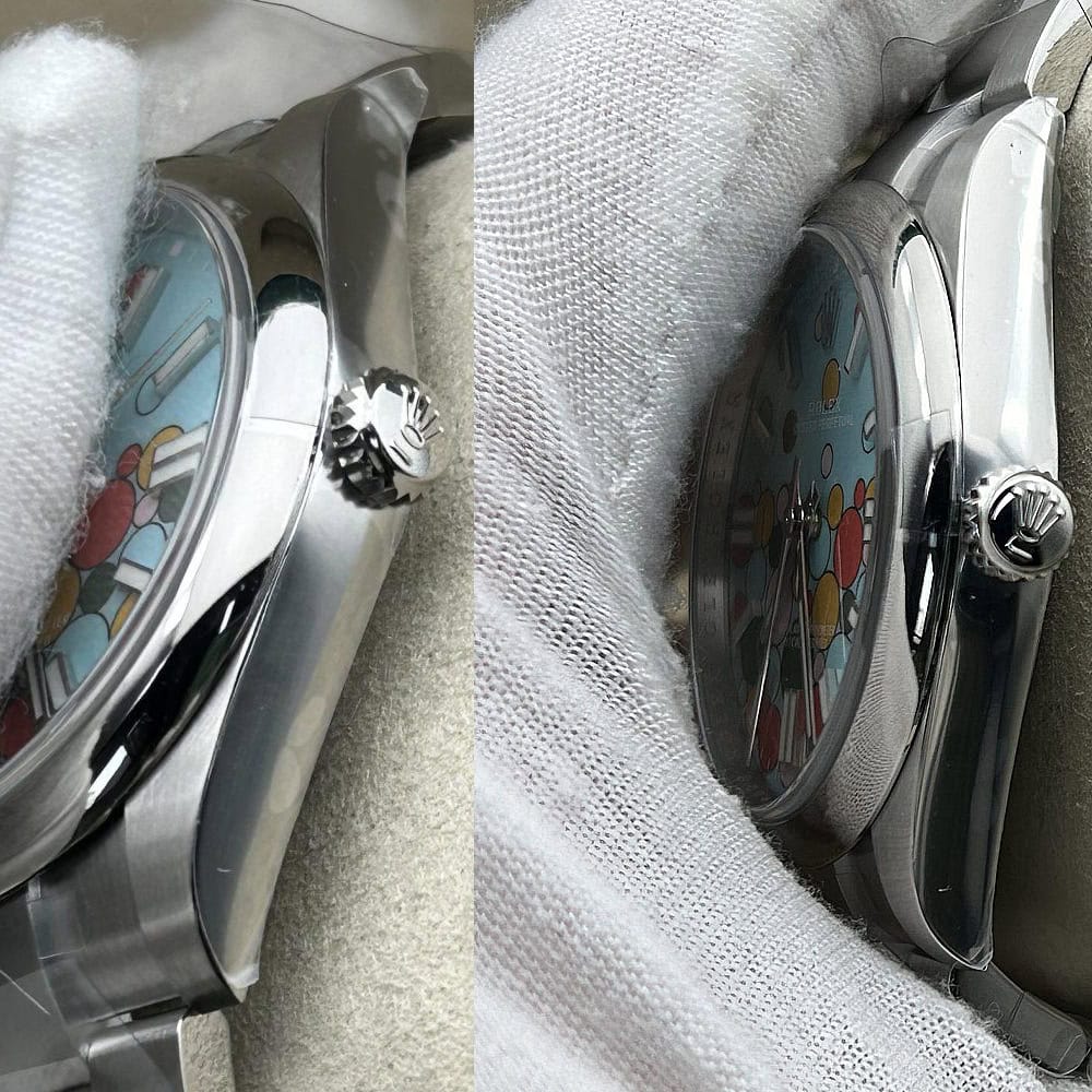 ケース:36ミリケースを備えており、この時計はソリッド904Lステンレススチールによってモノブロック構造にデザインされております。904Lステンレススチールはロレック「スオイスタースチール」ステンレススチール時計に採用されており、耐錆性で知られたスチールと同じです。ケースにはねじ込み式ケースバックとリューズを備えており、時計の防水性を高めています。Rehautリンクに刻まれたROLEX ROLEXも正しい位置合わせができるようになっております。寸法と重さも正規品と同じ、1:1で正規品と一致することを実現しております。
