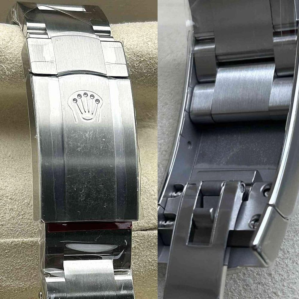 ケース:41ミリケースを備えており、この時計はソリッド904Lステンレススチールによってモノブロック構造にデザインされております。904Lステンレススチールはロレック「スオイスタースチール」ステンレススチール時計に採用されており、耐錆性で知られたスチールと同じです。ケースにはねじ込み式ケースバックとリューズを備えており、時計の防水性を高めています。Rehautリンクに刻まれたROLEX ROLEXも正しい位置合わせができるようになっております。寸法と重さも正規品と同じ、1:1で正規品と一致することを実現しております。