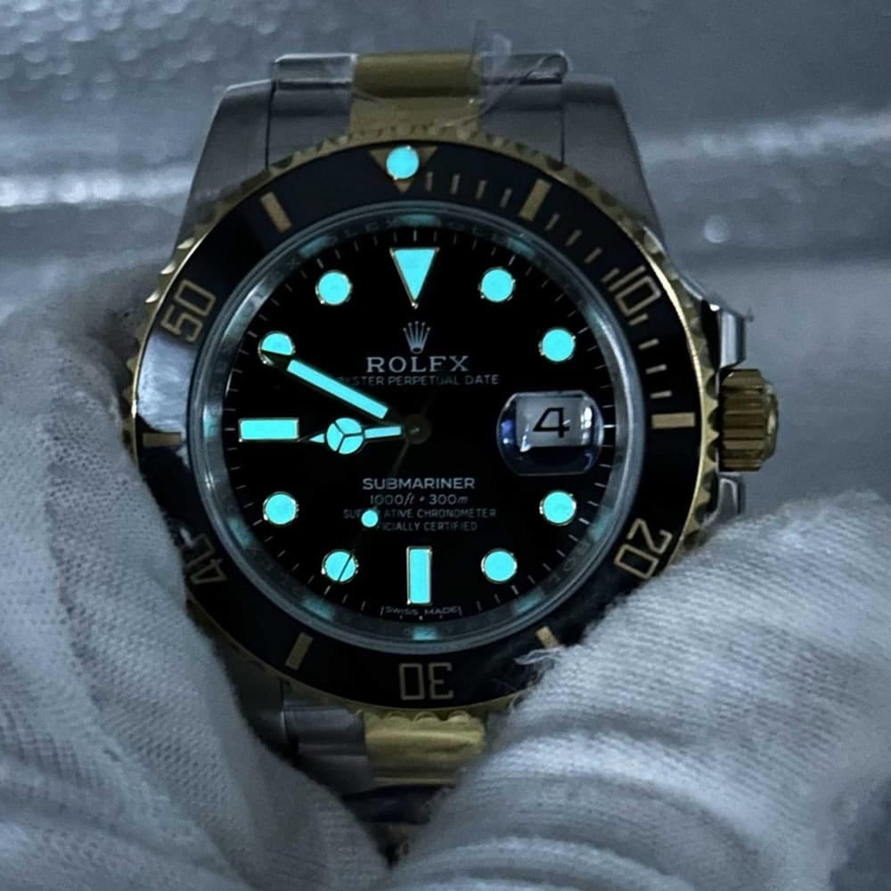 ベゼル:ベゼルは耐傷性ある頑丈なブラックセラミックインサートで飾られており、数字と目盛りは18Kイエローゴールドコーティングを施されています。120クリックで作動できる逆回転防止ベゼルには60分の目盛りがあります。スーパールミノバコーティングされたパールのデザインは正規品と100%同一で、すべてのティールは本物らしさを確保しています。