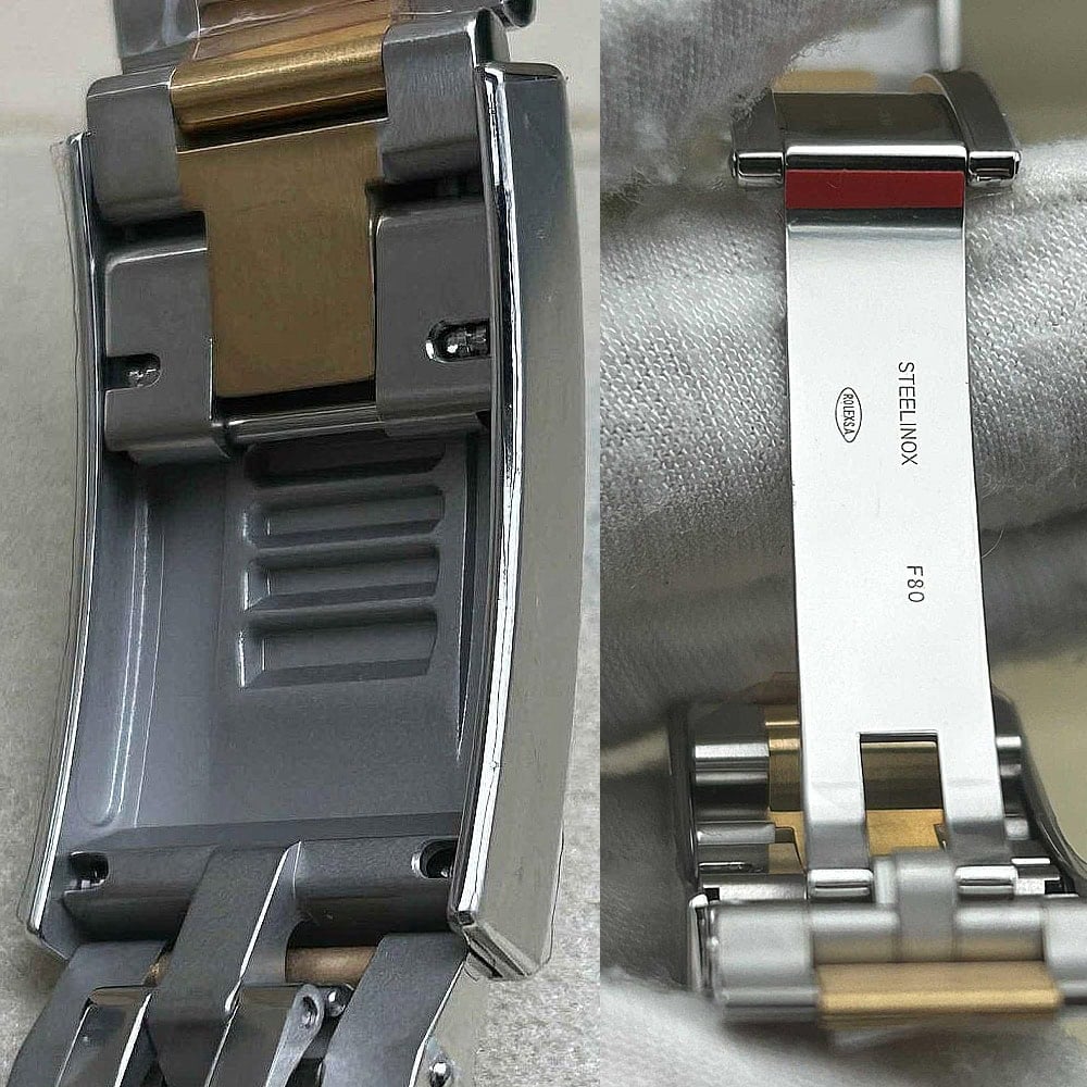 ベルト:フラートな3ピースリングを備えたオイスターデザインのブレスレットは正規品の21ミリケースラグと幅広のブレスレットにマッチします。18Kイエローゴールドコーティングされた904LステンレススチールにはDLCスクラッチプロティングコーティングが施されています。しっかりとしたネジ山、グライドロックダイバーズエクステンションシステムを含む折りたたみ式オイスターロック安全スクラップも備えています。