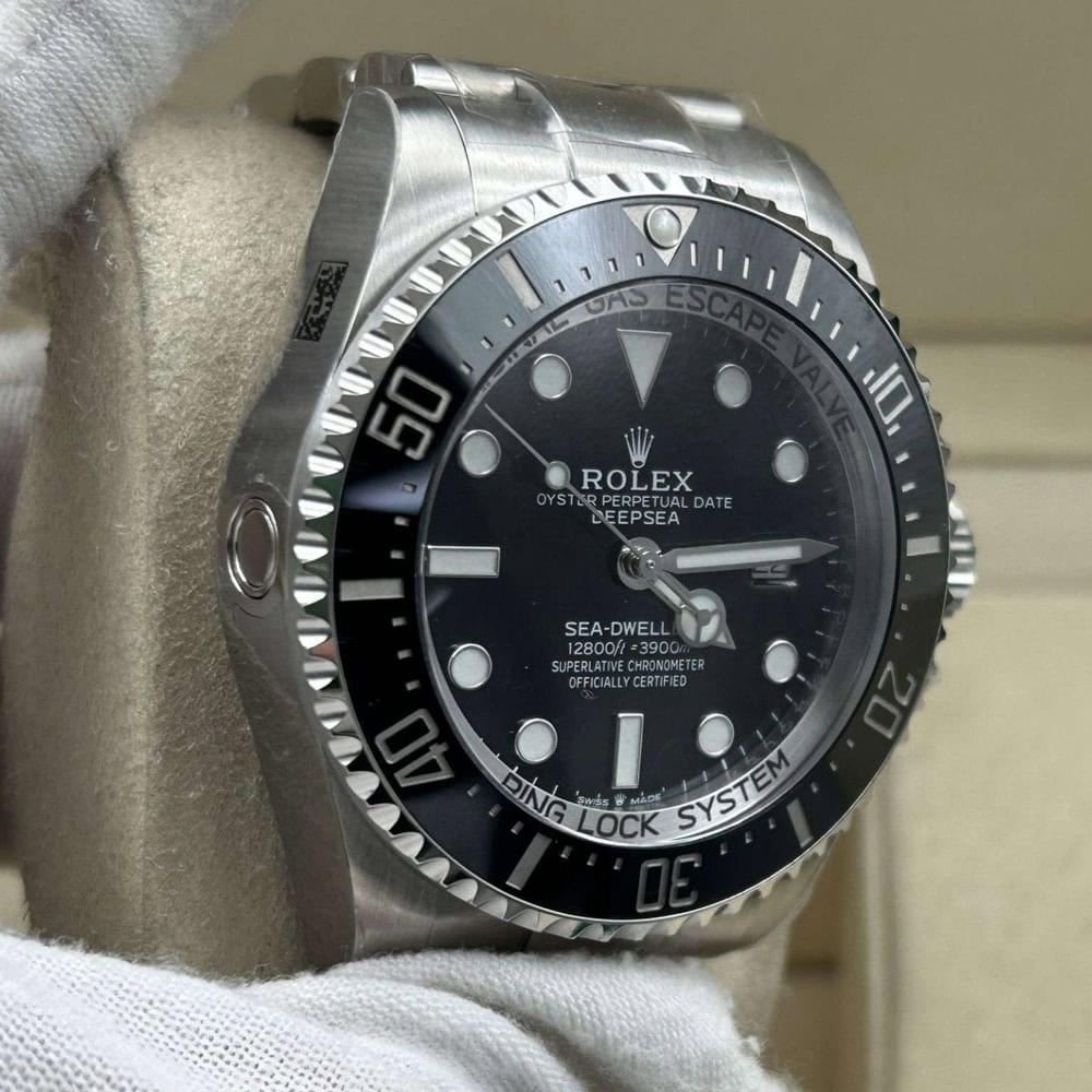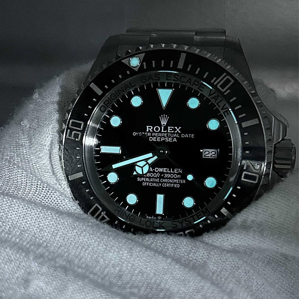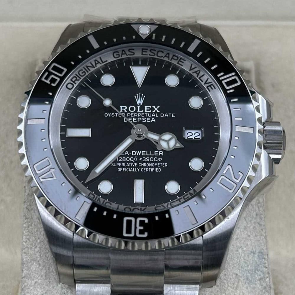ベゼル:60分目盛り入り逆回転防止ベゼルを備えたディープシーは、機能性とスタイルを兼ね備えています。耐傷性あるブラックセラミック製セラクロムベゼルインサートは、本物のプラチナでコーティングされた数字と目盛りが耐久性と長持ちを保証します。ブルーのスーパールミノバ コーティングされた パールが洗練された雰囲気を添え、本物のロレックス ベゼルのデザインを再現しています。