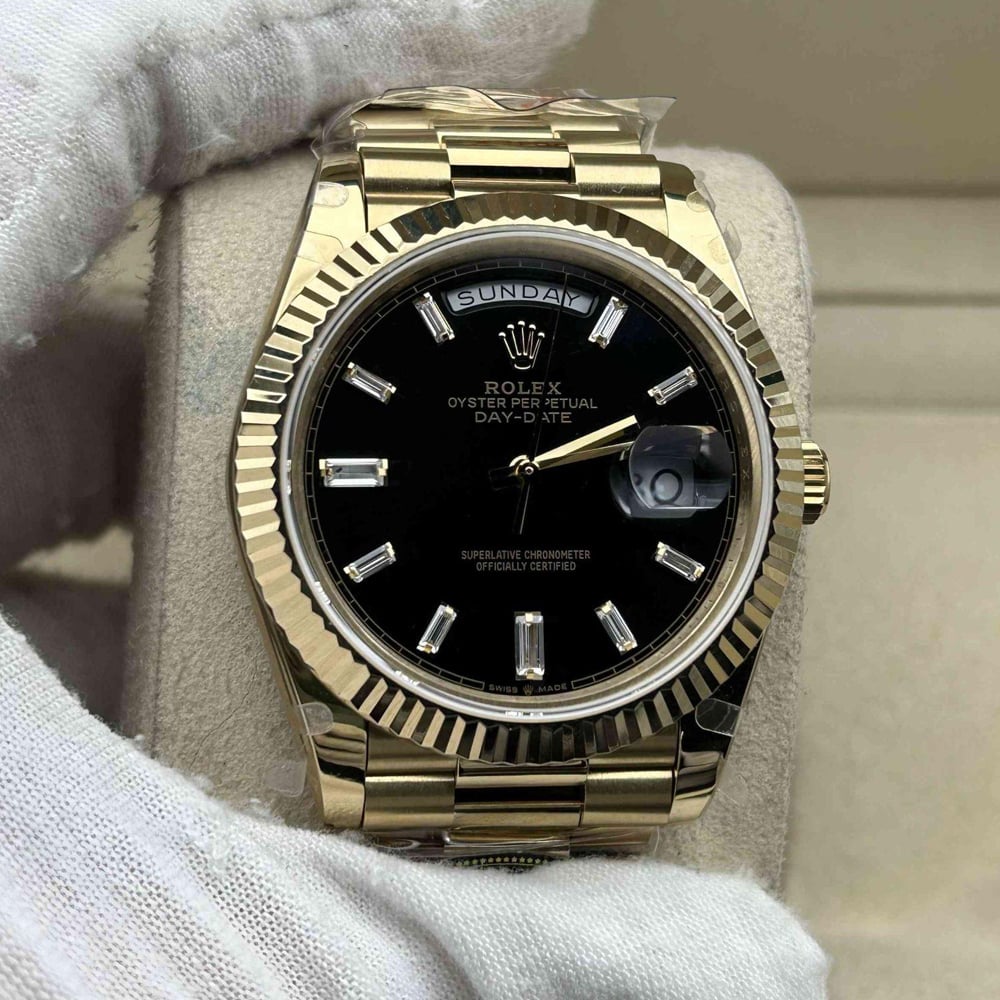 ケース:40mmのオイスターケースはロレックスのオイスタースチールにマッチし、ソリッドな904Lステンレススチールのモノブロック構造の上に18kイエローゴールドコーティングを5層施して作られています。スクリュー式のケースバックとねじ込み式リューズを備え、Rehautリングには「ROLEX ROLEX」のレーザー刻印が施されてい ます。寸法はオリジナルのロレックスとまったく同じです。