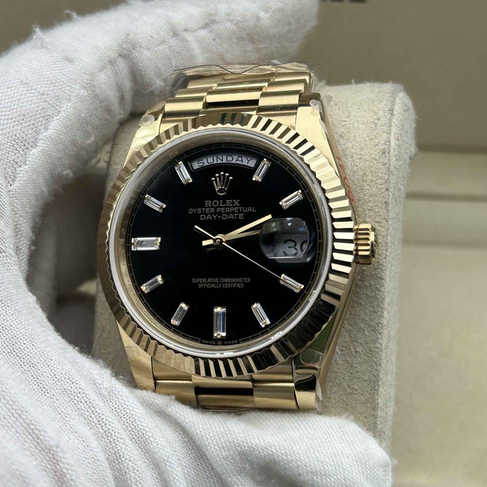 文字盤:このロレックスのレプリカ時計のブラック文字盤は、バゲットダイヤモンドのアワーマーカーで飾られ、優雅さと洗練さを醸し出しています。クリーンファクトリーのレーザーで精密に作られたテキスト、印刷、彫刻が施された文字盤は、本物のロレックスのものと見分けがつきません。正しいデイトフォントとサイズを採用しており、針に施された18Kイエローゴールドコーティングは色落ちを防ぐできるのみならず、長年に渡っても、不変の美しさと読みやすさを確保しております。