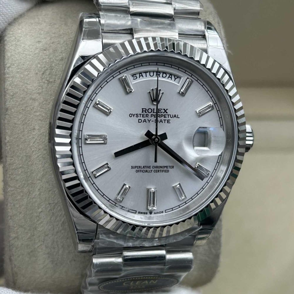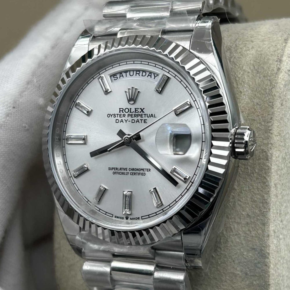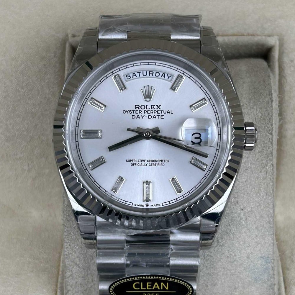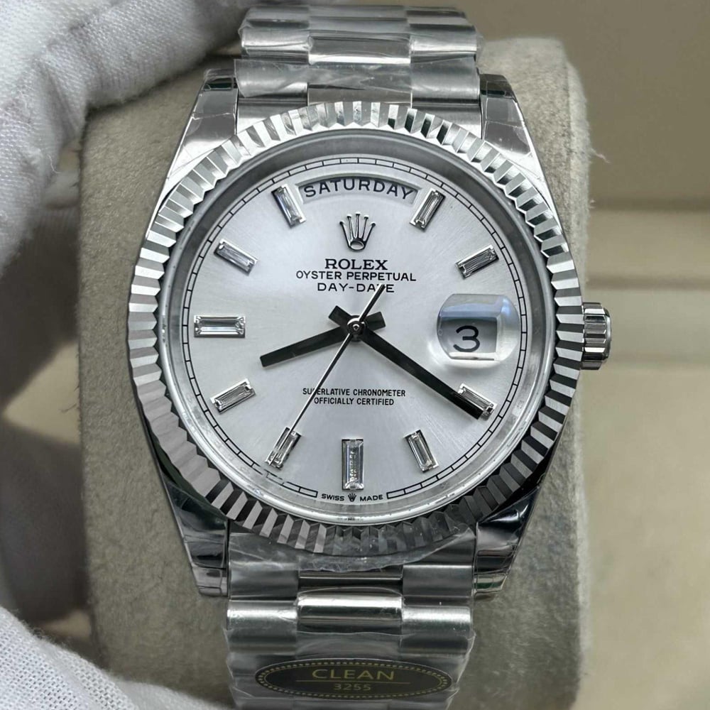 ロレックススーパーコピーデイデイト40mm 228239 、ダイヤモンド入りシルバーダイアル クローンCal.3255ムーブメント