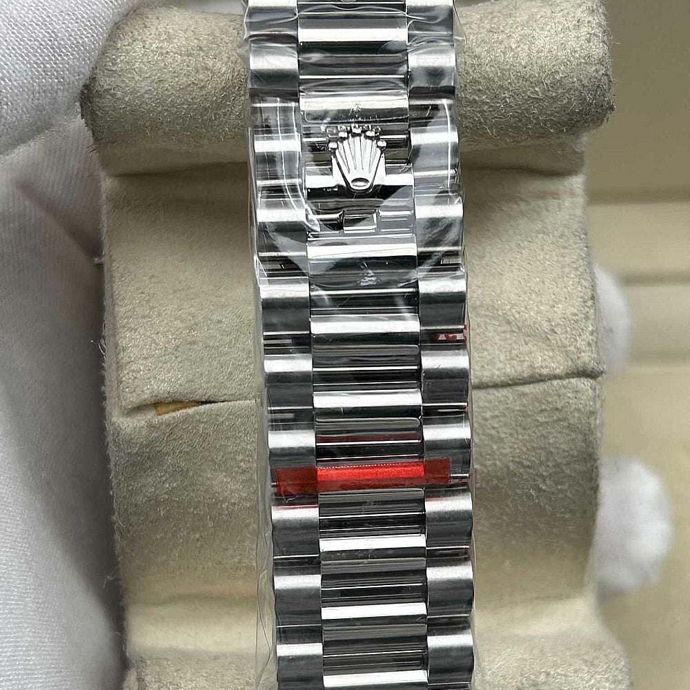 ベルト:半円形の3列リンクのプレジデントブレスレットは18Kホワイトゴールドコーティングされた904Lステンレススチールで作られており、DLCスクラッチプロテクションコーティングが施されています。しっかりとしたネジ山で簡単にベルト調整が可能です。また、コンシールド?クラウン?クラスプを備え、素早く快適にベルトを装??着できることを確保しています。