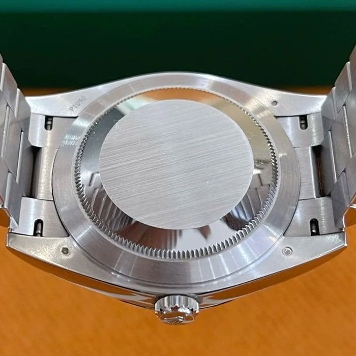 スクリュー式のケースバックとねじ込み式リューズを備え、Rehautリングには「ROLEX ROLEX」のレーザー刻印が施されてい ます。