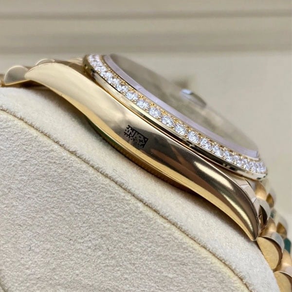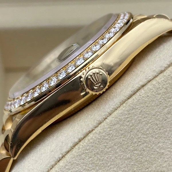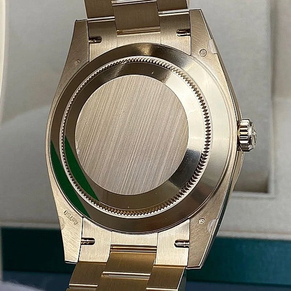 スクリュー式のケースバックとねじ込み式リューズを備え、Rehautリングには「ROLEX ROLEX」のレーザー刻印が施されてい ます。