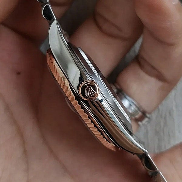 オイスタースチールとエバーローズゴールドを組み合わせた、美しいデザインの腕時計です。