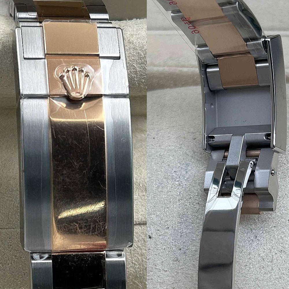 ベルト:クラシックなオイスターデザインのブレスレットは18Kローズゴールドでコーティングされた904Lステンレススチールで作り出されており、DLCスクラッチプロテクションコーティングが施されています。しっかりとしたネジ山、折りたたみ式オイスターロック安全クラスプとEasylink 5mmコンフォートエクステンションリンクが含まれています。