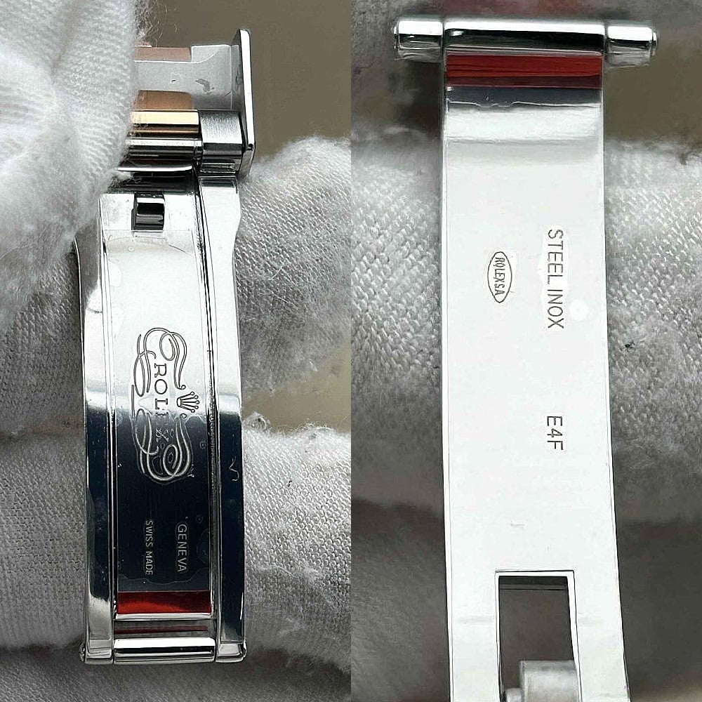 ケース:頑丈な904Lステンレススチールで作り出された40ミリケースには18Kローズゴルードコーティングを精緻に施されており、本物のロレックススチールのモノブロック構造に従っています。ケースにはねじ込み式ケースバックと巻き上げリューズをを採用し、ROLEXROLEXのレーザー彫刻とDLC防傷コーティングを備えています。寸法と重量はオリジナルと完全に同じで、本物の部品との互換性を確保しています。