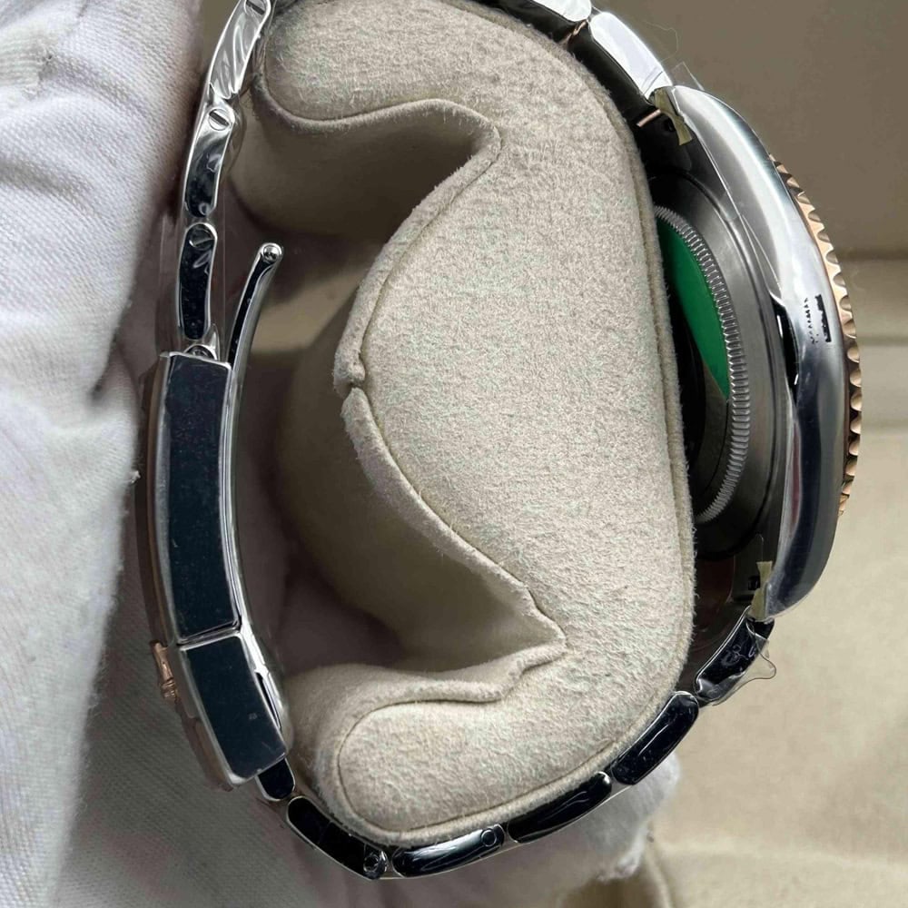 ベゼル:18K ローズゴールド加工を施されたソリッド904L ステンレススチールで作り出されたベゼルは120 クリックの双方向回転機能と60分の目盛を備えています。盛り上がったポリッシュ仕上げ目盛りとサンドブラスト仕上げ、及び、18Kイエローゴールドでコーティングされた数字と目盛りが本物のロレックスと一致するようにデザインされています。