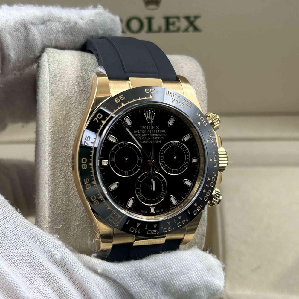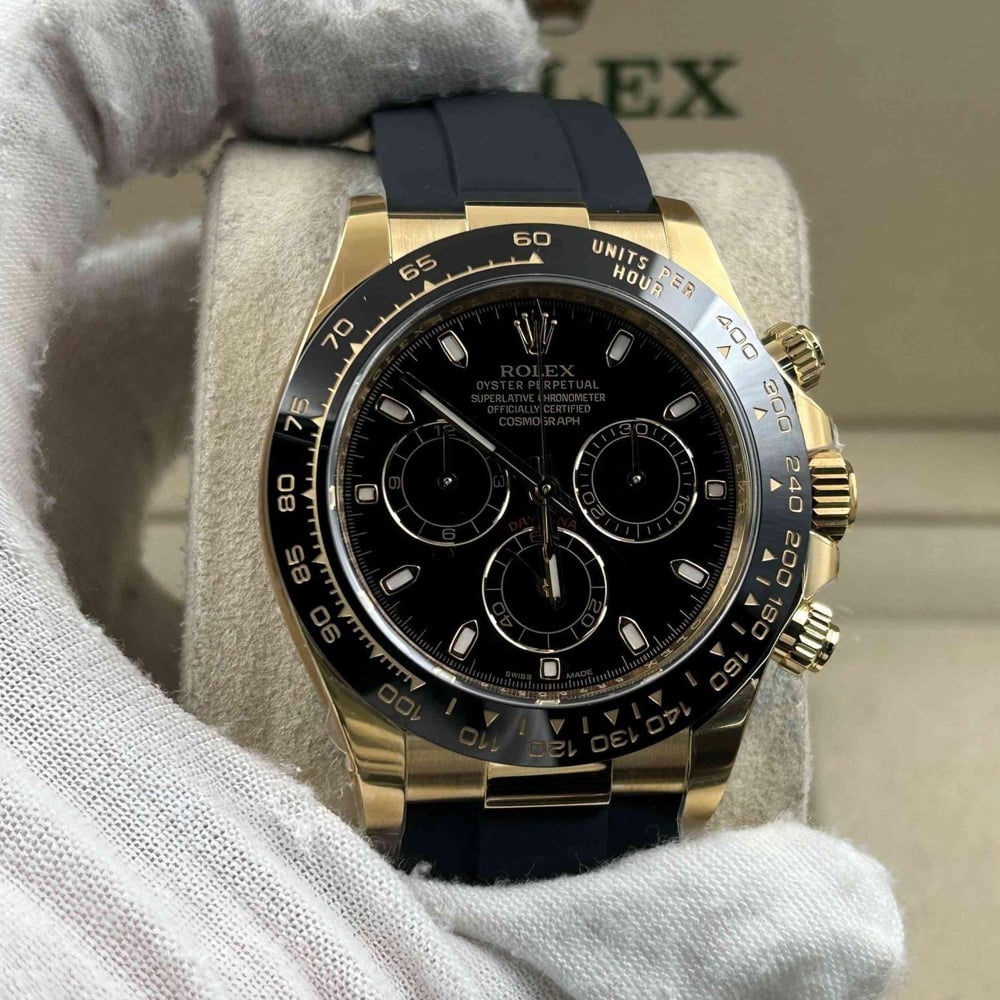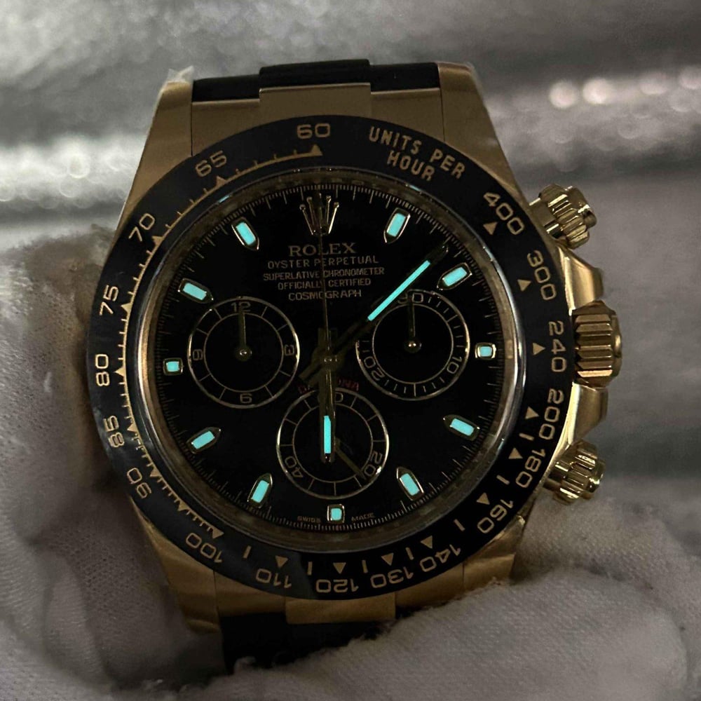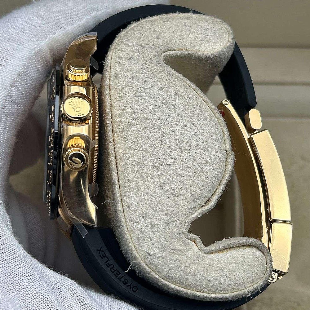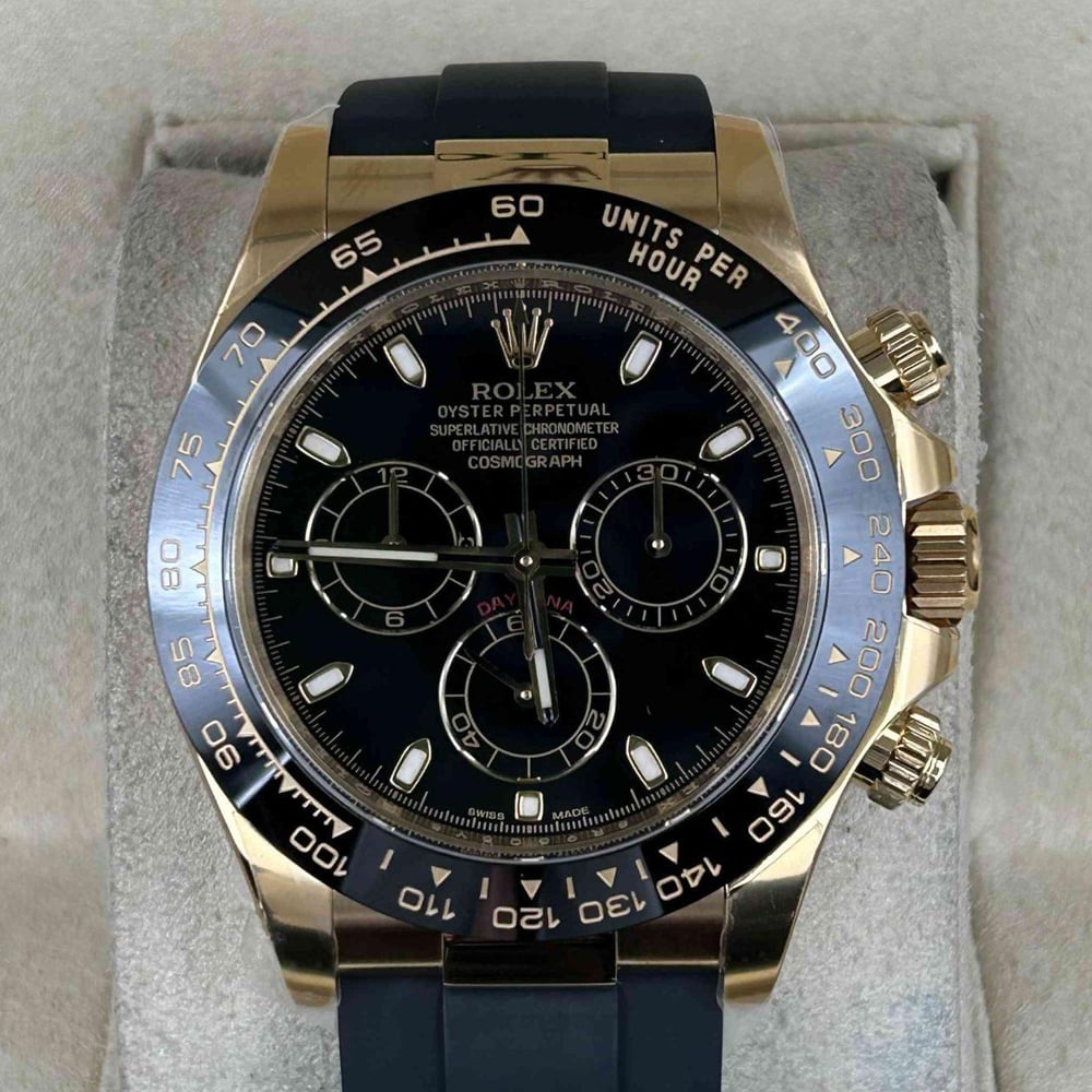 ベゼル:頑丈なブラックのモノブロック?セラミックベゼルが固定されており、タキメータースケールが刻まれています。数字と目盛りは18Kイエローゴールドでコーティングされており、すべての細部においてオリジナルのロレックスデザインと一致しています。
