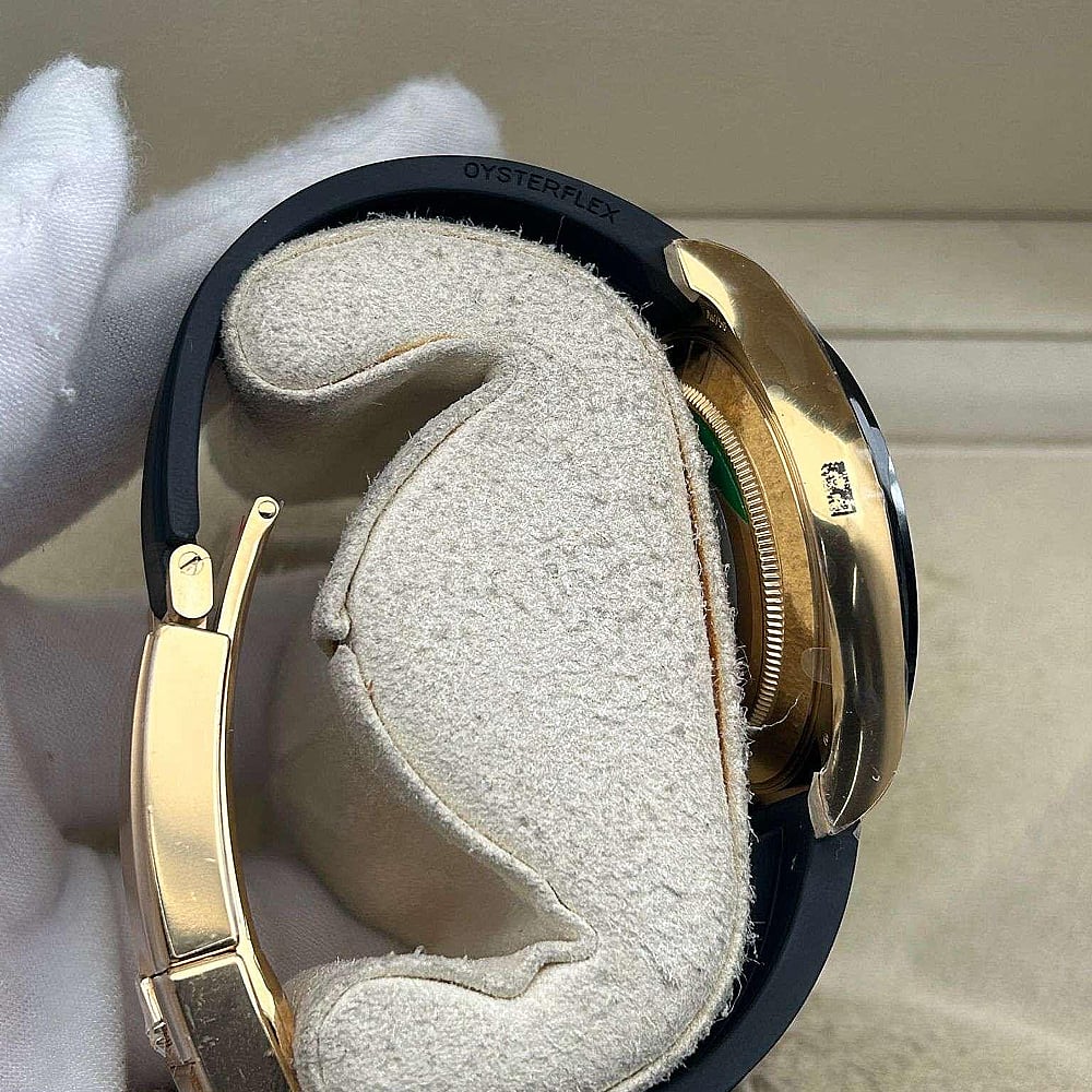 ベルト:メタルブレードの芯にブラックのエラストマーをオーバーモールドされた高性能のラバー製オイスターフレックス?ブレスレットは耐久性と快適性を備えております。 ベルトには18kイエローゴールドコーティングされたソリッドな904Lステンレススチールによって作り出された折畳式オイスター安全スクラップを備えており、確実なフィット感を確保しております。