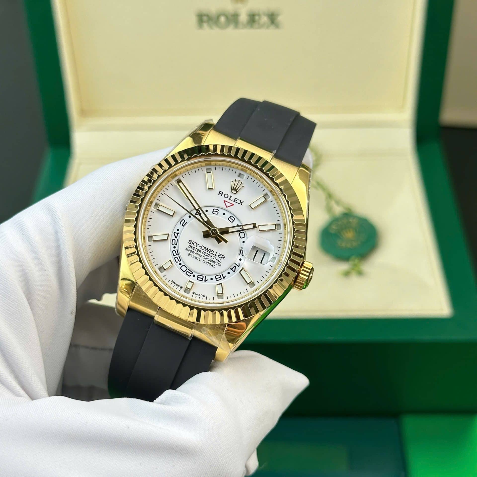 スクリュー式のケースバックとねじ込み式リューズを備え、Rehautリングには「ROLEX ROLEX」のレーザー刻印が施されてい ます。