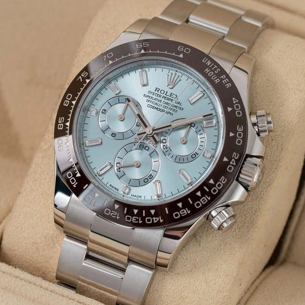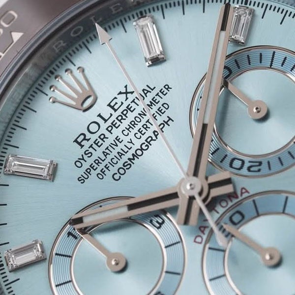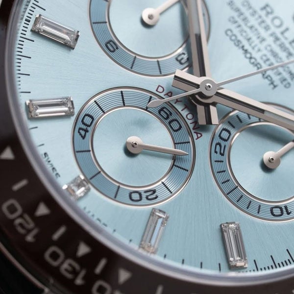 文字盤:アイスブルーの文字盤はモアサナイト?ダイヤモンドのアワーマーカーが特徴で、