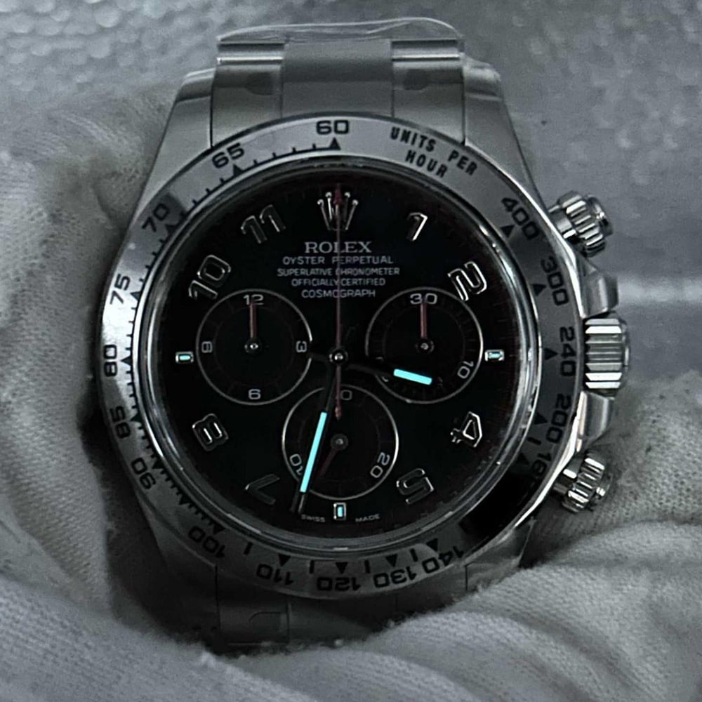 ベゼル:クリーンファクトリーは18Kホワイトゴールドでコーティングされた頑丈な904Lステンレススチール製の固定ベゼルを採用しています。ベゼルには黒くコーティングされた数字と目盛りが刻まれたタキメータースケールが備わっています。構造とデザインは本物のロレックスと100%一致しています。