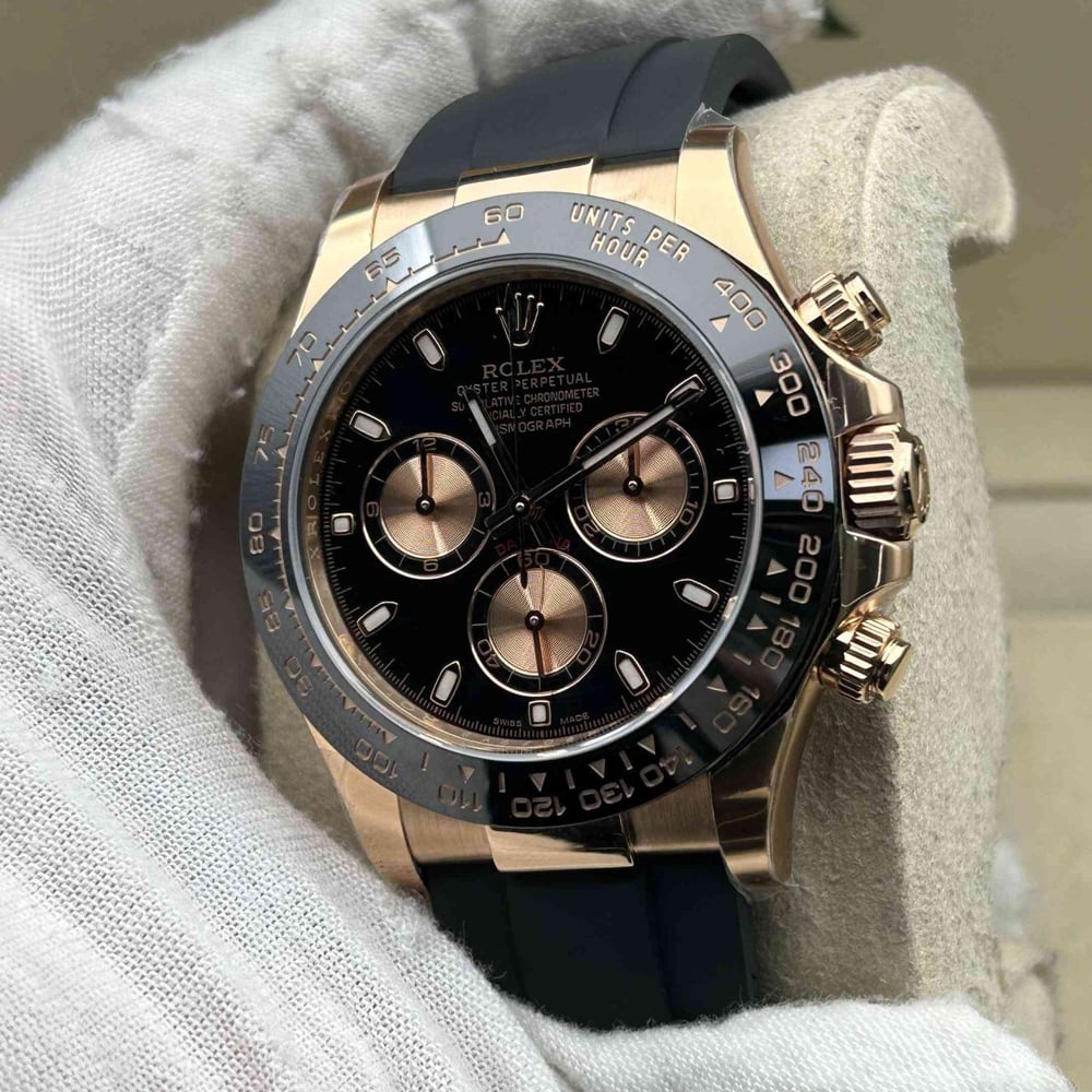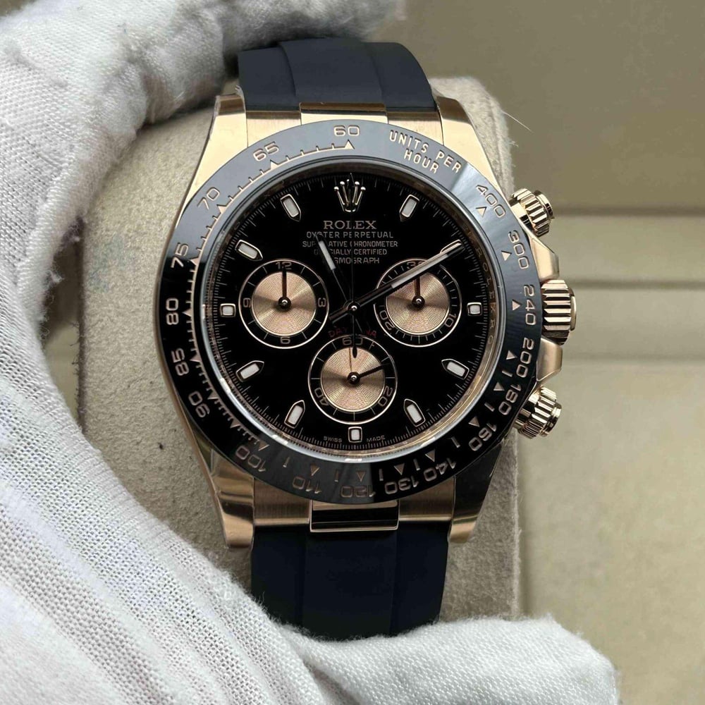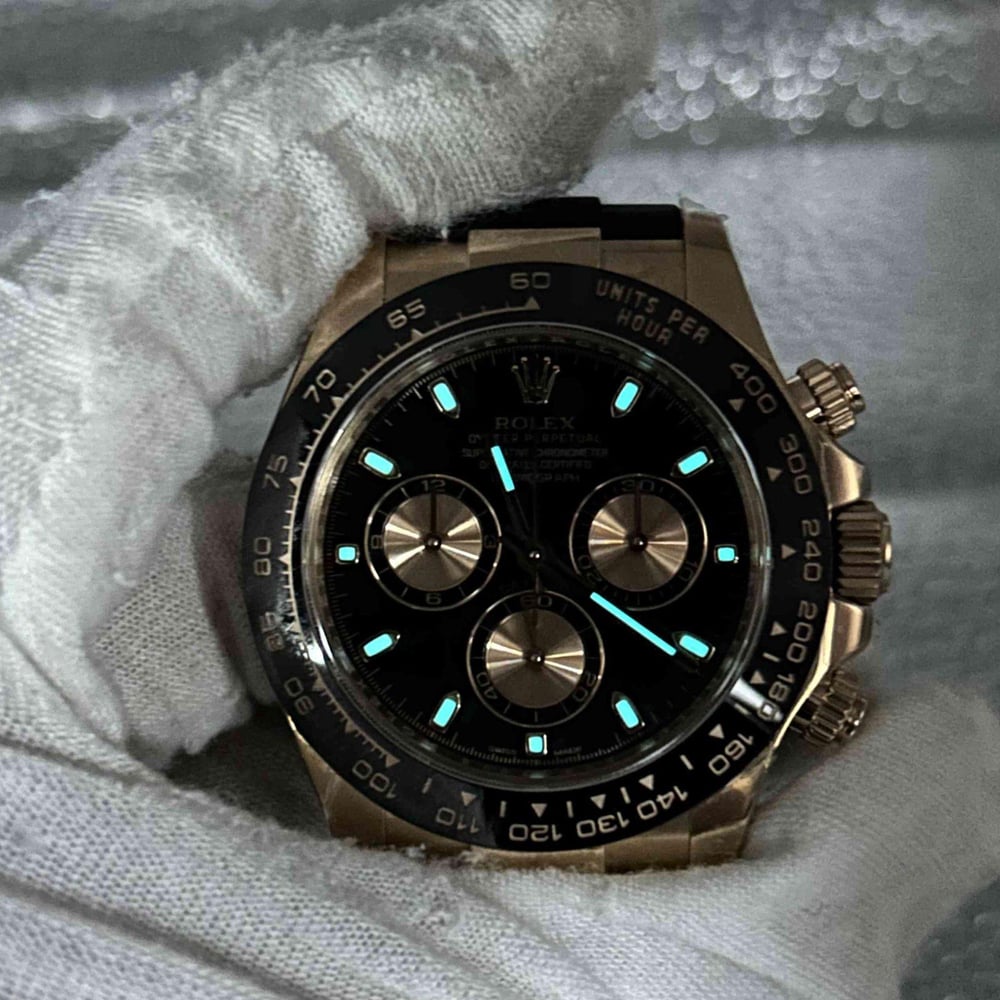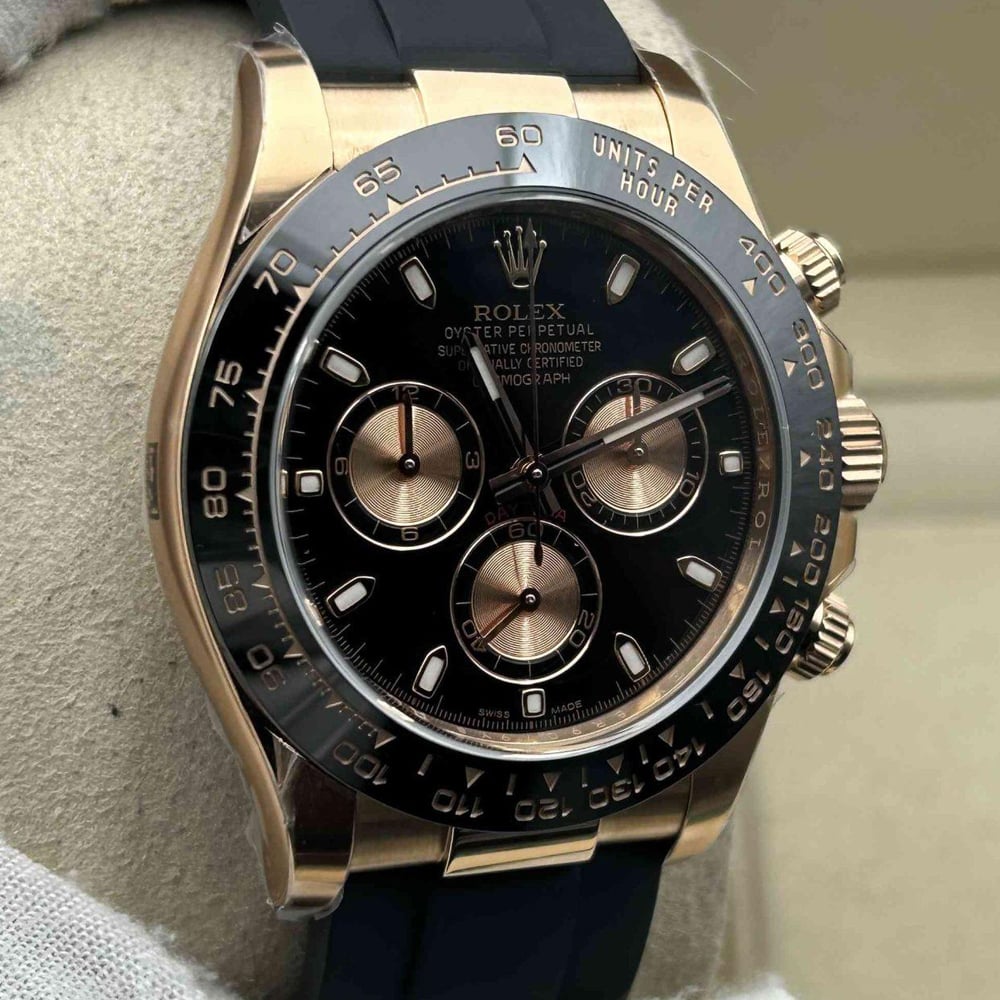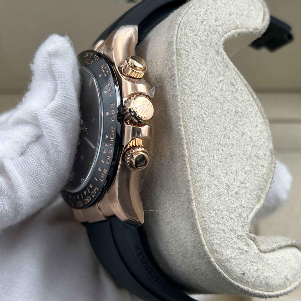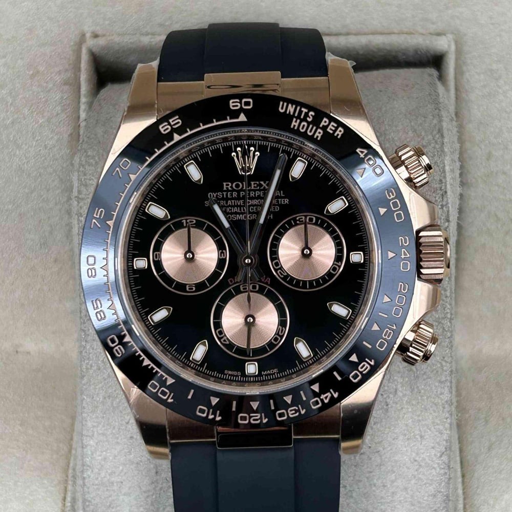ベゼル:頑丈なブラックのモノブロック?セラミックベゼルが固定されており、タキメータースケールが刻まれています。数字と目盛りは18Kローズゴールドでコーティングされており、すべての細部においてオリジナルのロレックスデザインと一致しています。
