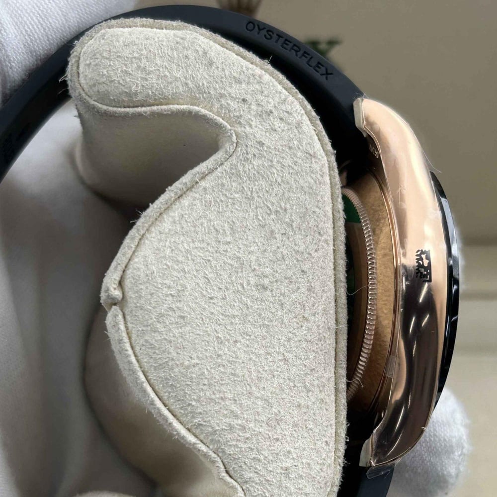 ベルト:メタルブレードの芯にブラックのエラストマーをオーバーモールドされた高性能のラバー製オイスターフレックス?ブレスレットは耐久性と快適性を備えております。 ベルトには18kローズゴールドコーティングされたソリッドな904Lステンレススチールによって作り出された折畳式オイスター安全スクラップを備えており、確実なフィット感を確保しております。