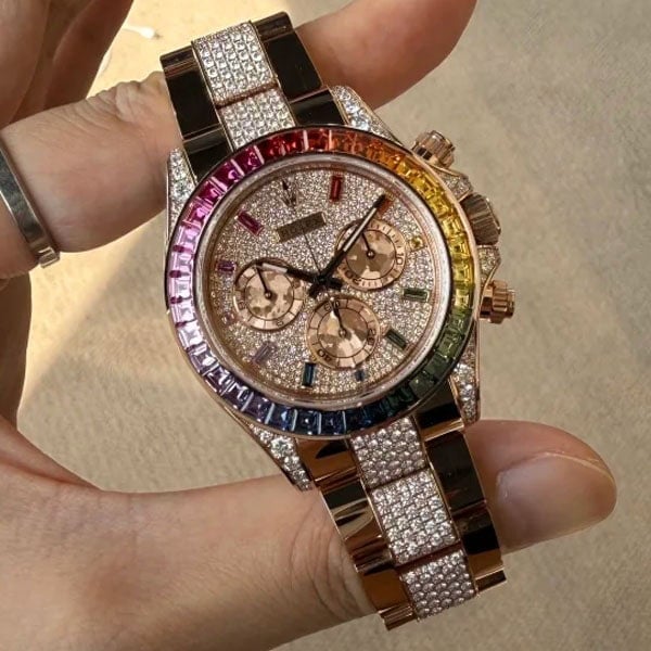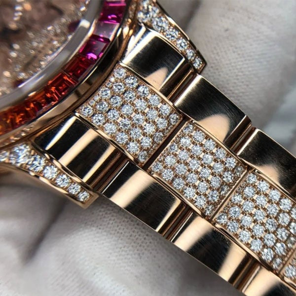 ダイヤモンドが敷き詰められた文字盤とローズゴールドのサブダイヤル、そして夜光針が、この時計をさらに際立たせています。