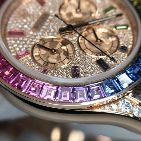 サファイアがセットされたレインボーカラーのベゼルと、ダイヤモンドがセットされたラグとリューズガードが特徴です。