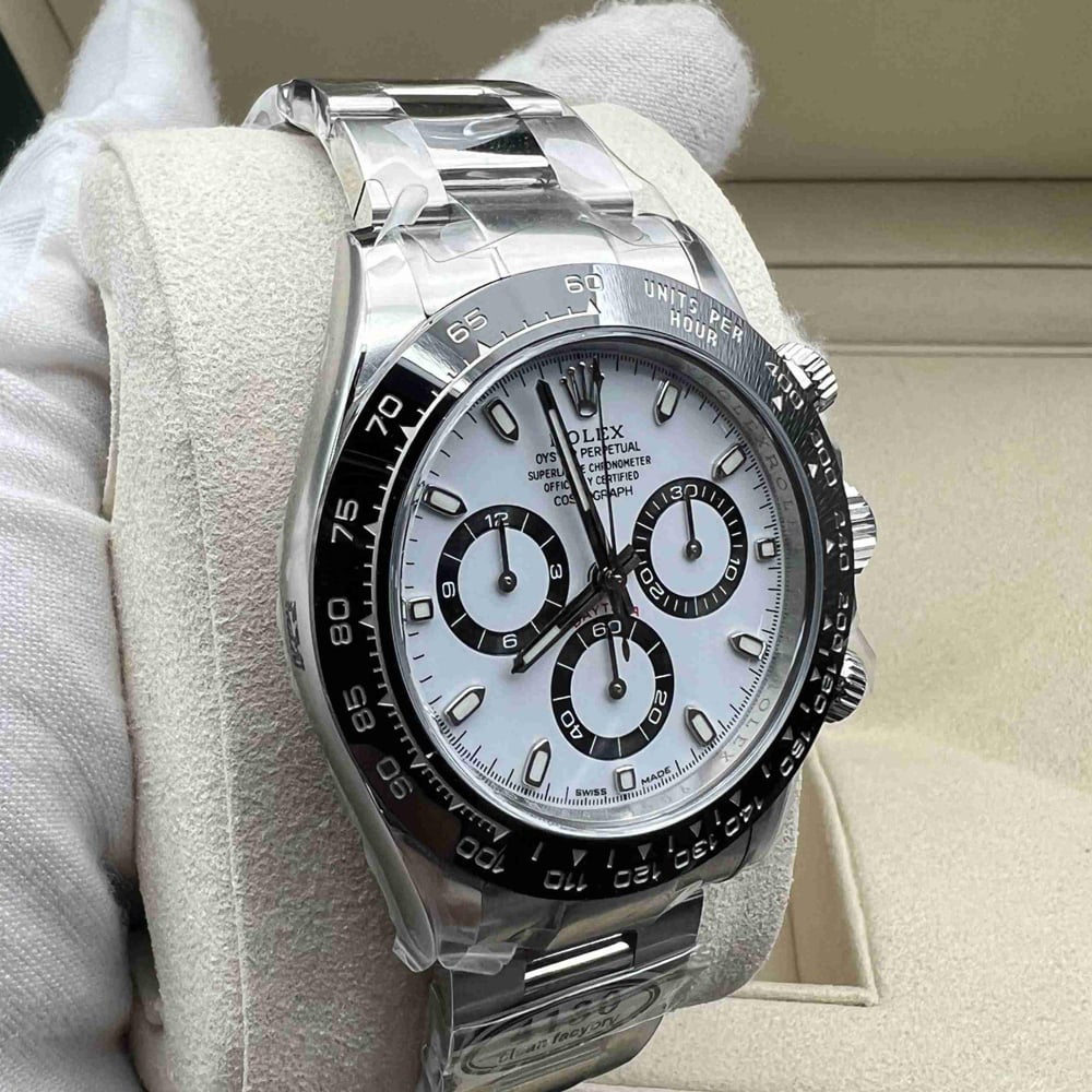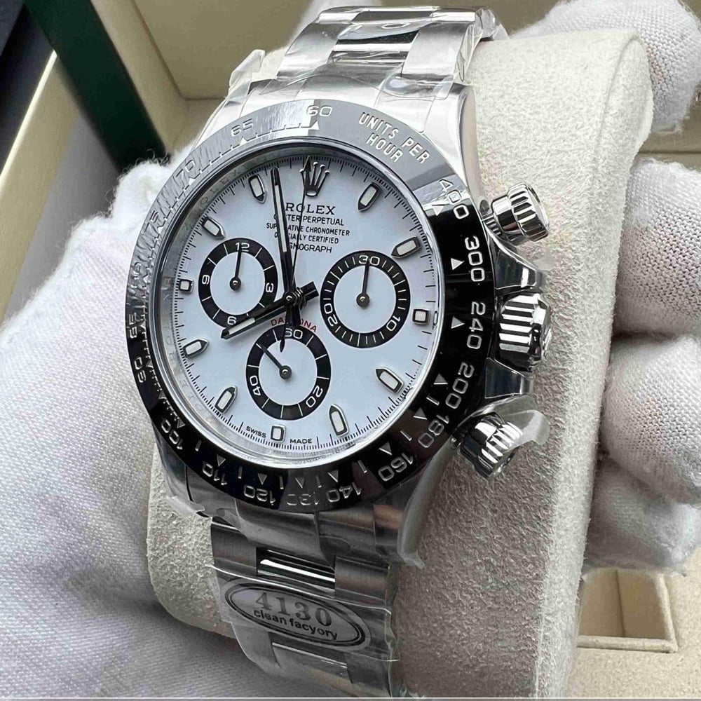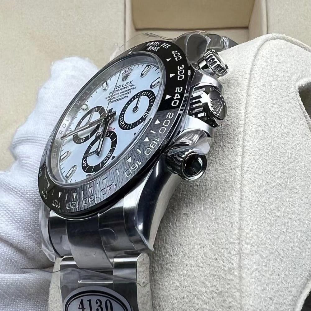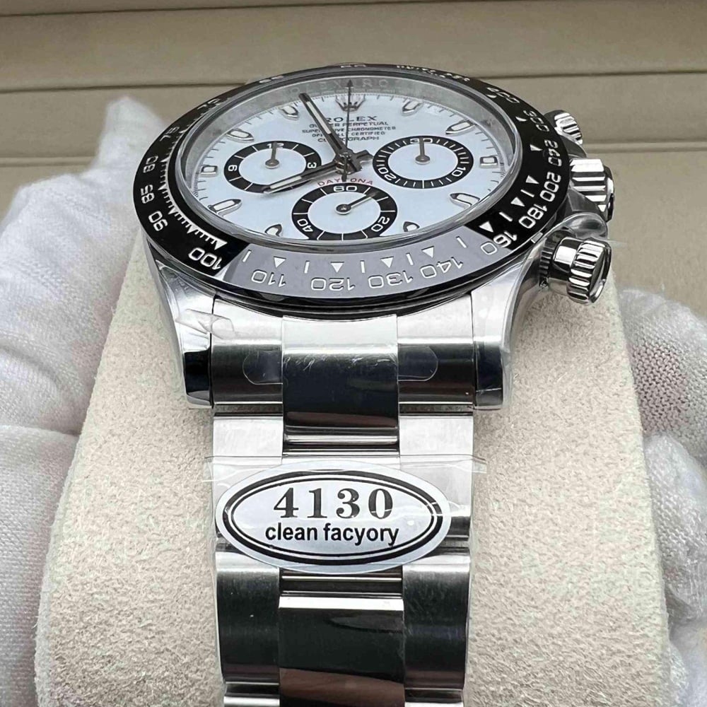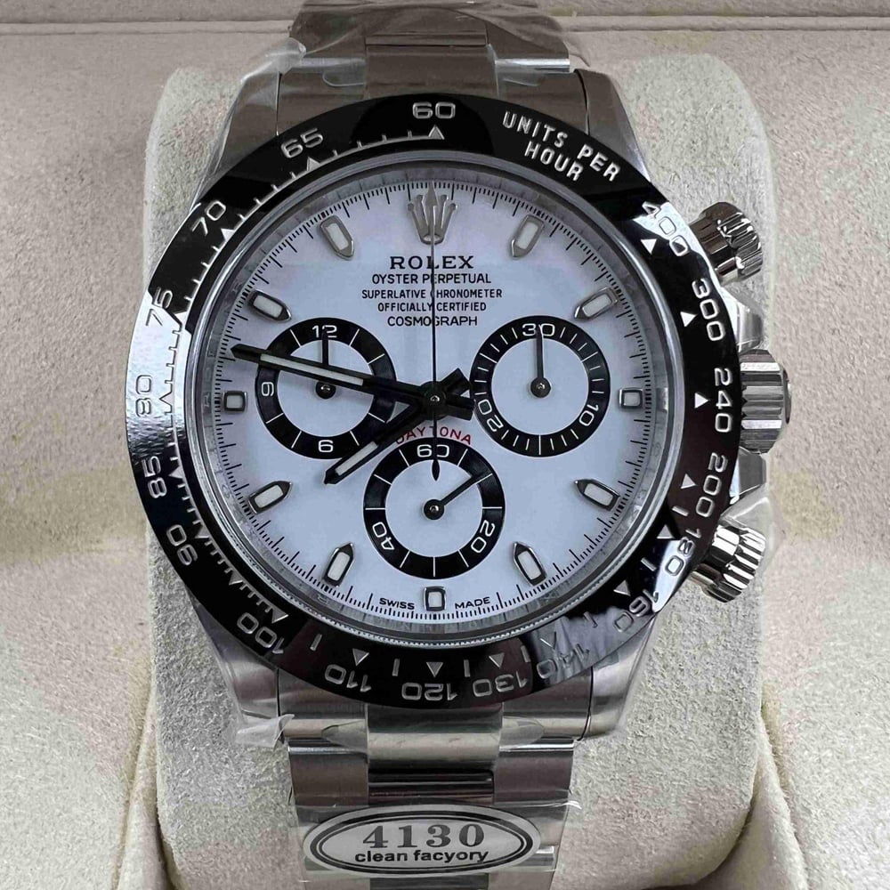 文字盤:デイトナの一番人気「パンダ」文字盤です。文字盤のベースカラーは見事なホワイトカラーで、インダイヤルはブラックカラーのリンクで囲まれています。ワーマーカーと針は明るい夜光スーパールミノバブルー発光蓄光でコーティングされており、夜間で9時間まで均一に明るく発送できます。レーザー精密なテキスから、印刷、彫刻まで、すべてのディテールは正規品と同一です。Cleanファクトリーはアワーマーカーと針に18Kホワイトゴールド コーティングを施し、色落ちは全然無いです。