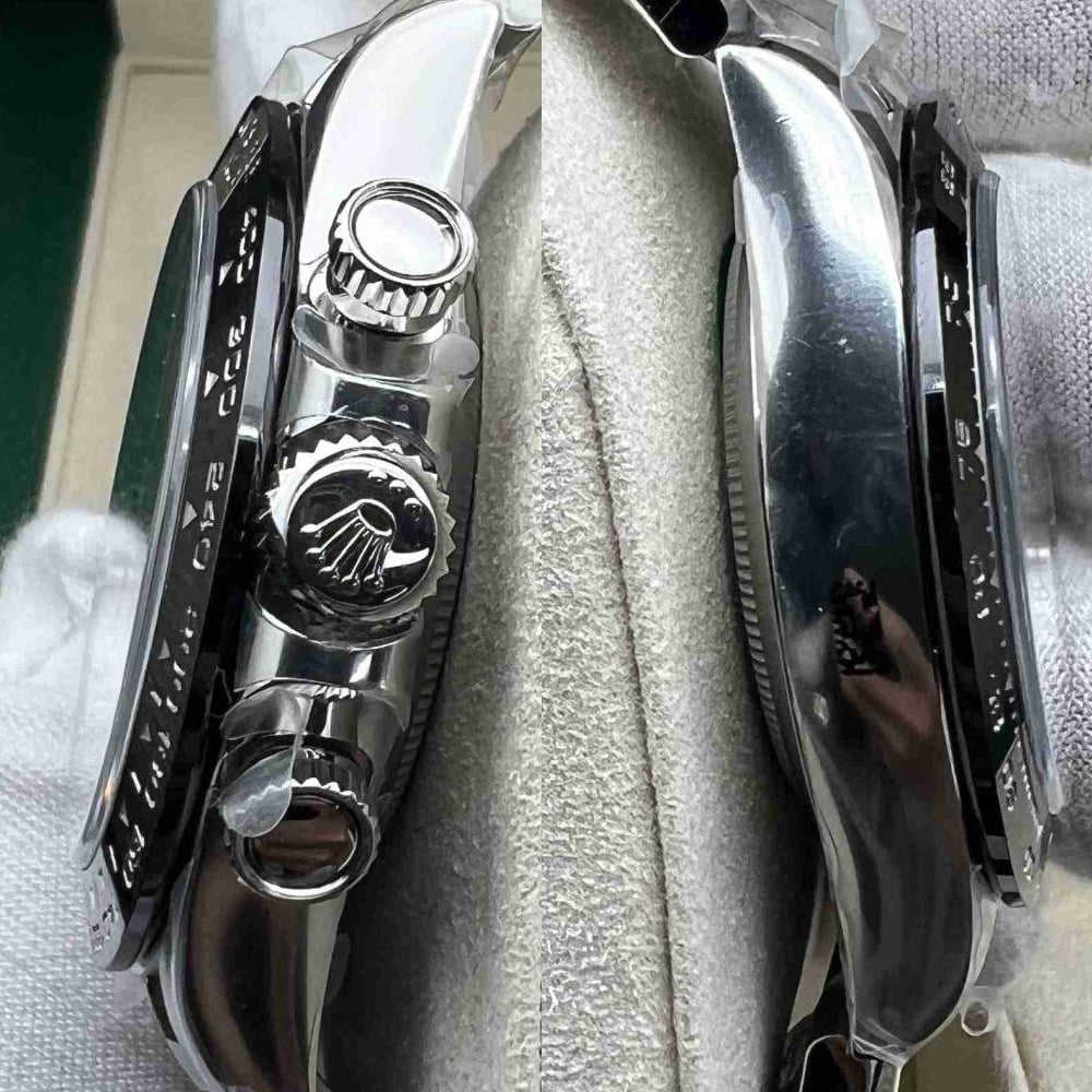 ベゼル:ベゼルは色あせしにくく、固定式(動けない)ブラックセラミックベゼルにはプラチナ マークが施されています。クリーンファクトリーベゼルはエリートレベルの精度で設計され、その組成と着色技術は、オリジナルのセラクロム?セラミック?アウターベゼルと同一です。