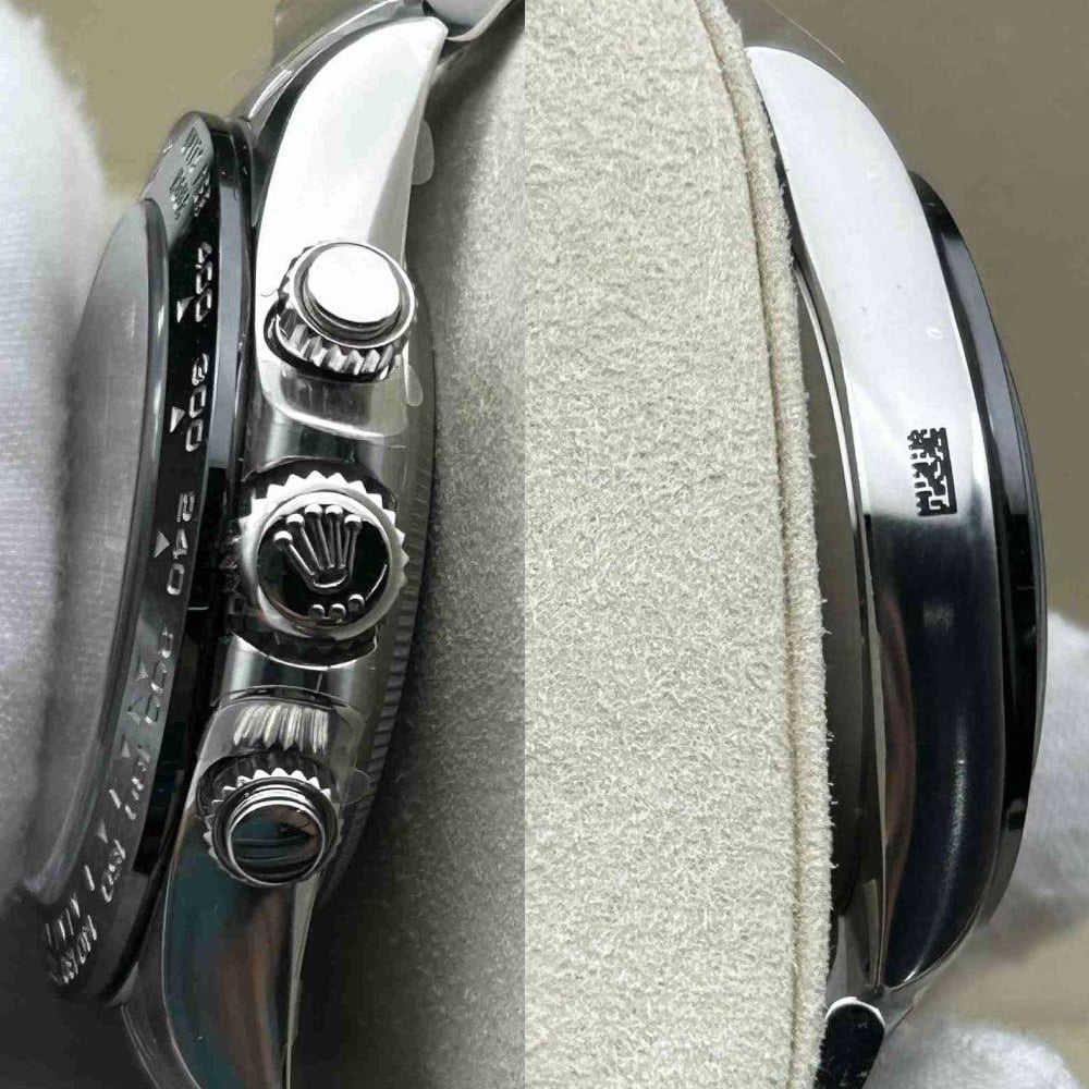 ケース:クリーンファクトリーは40mmの一体型904Lステンレス製モノブロックを採用し、本物のロレックスステンレスに一致しています。ねじ込み式のケースバック、プッシュボタン、巻き上げリューズが特徴で、すべて合成ゴムで密閉されており、完璧な防水性を備えています。Rehautリンクに施されたROLEXROLEXレザー刻印が時計の真実性を確保でき、DLCスクラッチプロテクション?コーティングは時計の耐久性を確保できます。寸法と重さが完璧に再現されたため、楽に正規品部品と交換することができます。