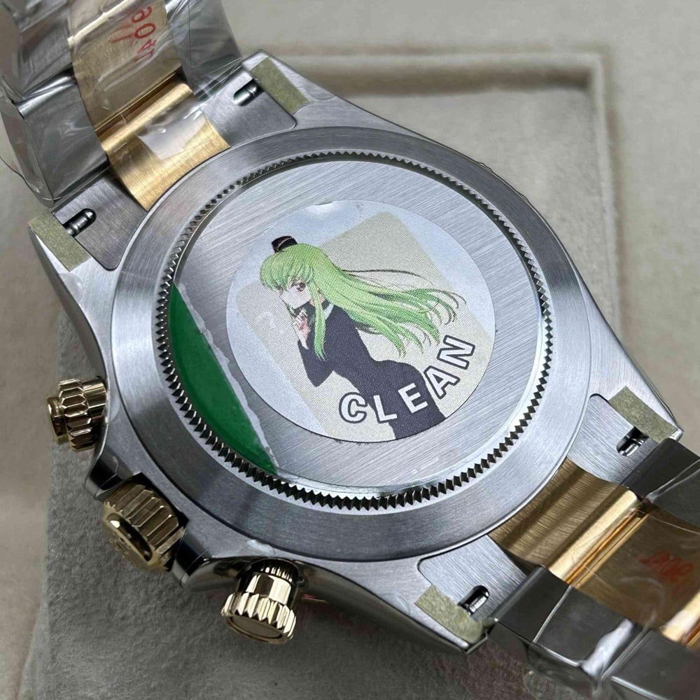 ケース:クリーンファクトリーは40ミリケースを備えており、18Kイエローゴールド加工を施されたソリッド904Lステンレススチールは本物ロレックススチールのモノブロック構造に似ています。スクリュー式ケースバックとプッシュボタン、巻き上げリューズは合成ラバーで密封されており、時計の防水性を確保しています。時計のRehautリンクには‘ROLEXROLEXレザー刻印があり、DLCスクラッチプロティングコーティングを施されております。すべての寸法はロレックス正規品と同一であり、すべての部品をオリジナルと交換できることが保証されています。
