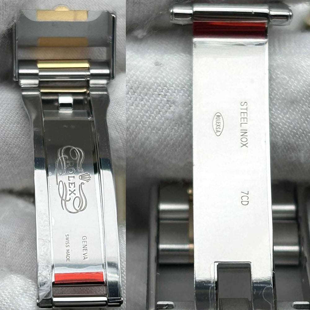 ベルト:ベルトは平たい3ピースリンクを象徴とするクラシックなオイスターデザインを採用されており、18Kイエローゴールドコーティングされた904Lステンレススチールで作り出されており、DLCスクラッチプロティングコーティングも施されています。ベルトはしっかりとしたネジ山と5 mm コンフォート エクステンション リンク(イージリンクとも言う)を備えた折りたたみ式オイスターロック安全クラスプを含まれています。