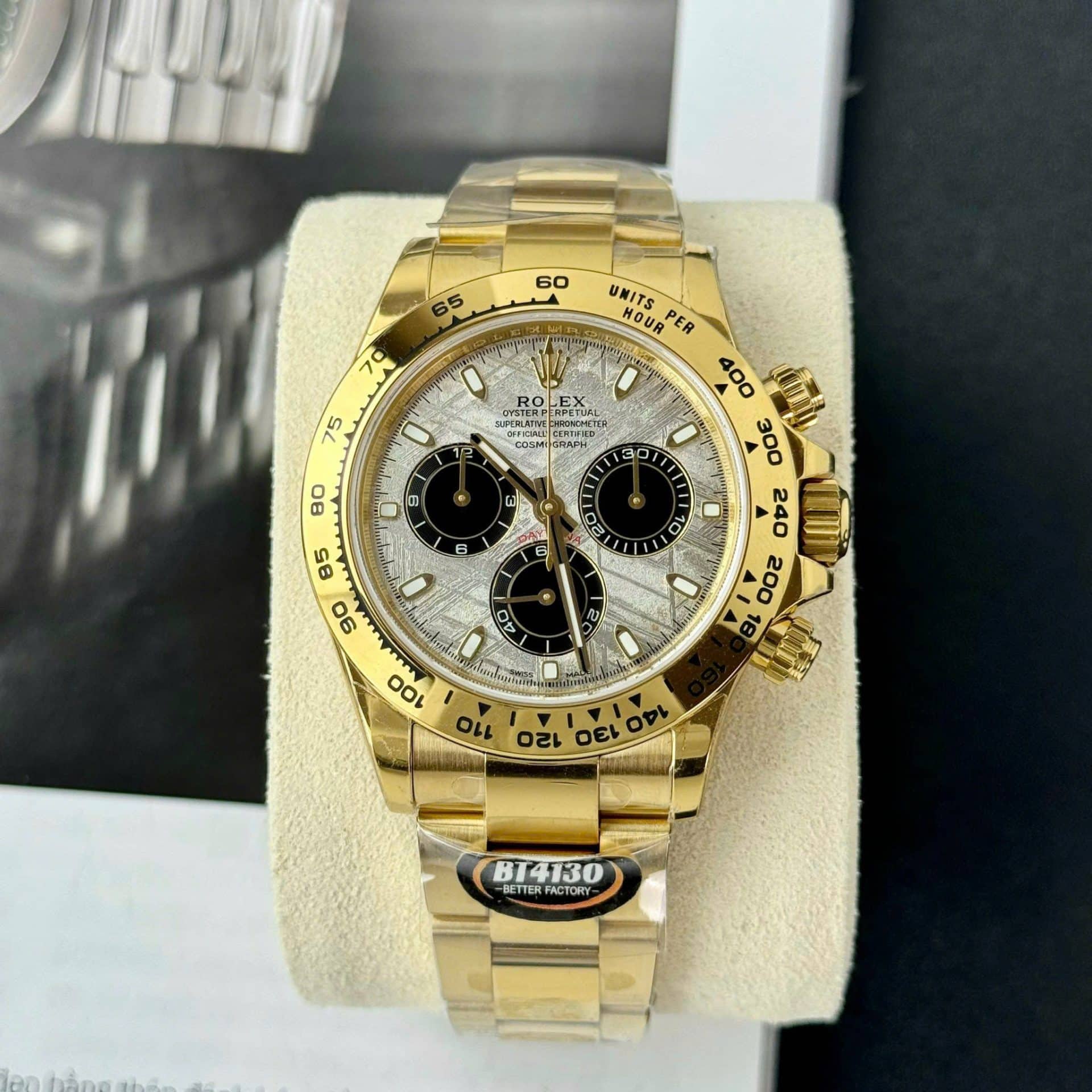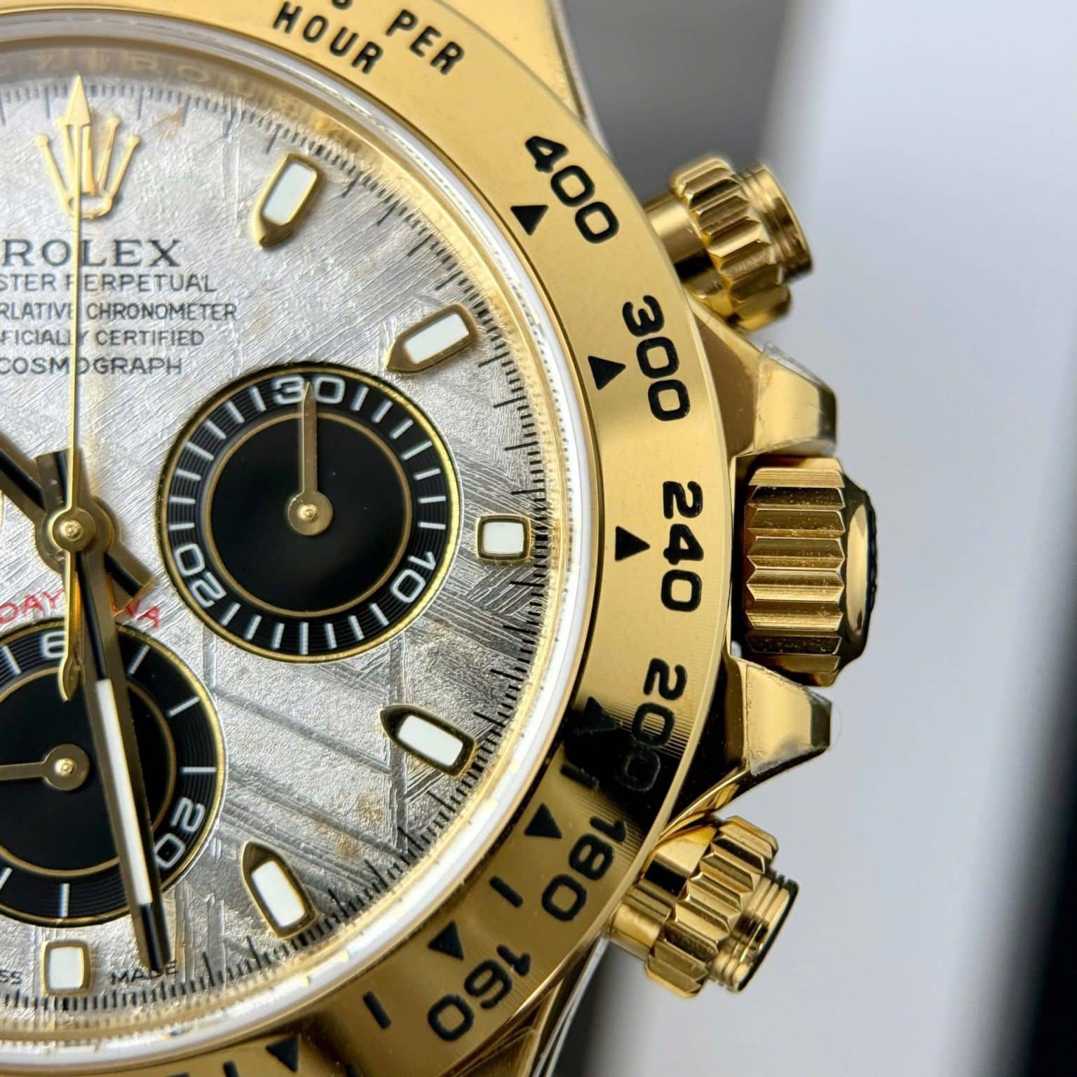 高いコストを厭わずに、ベゼル、風防ガラス、内部カバー、ダイヤル、針、バックルなどの部品を本物と見分けがつかないレベルで製造しています。ロレックスのデイトナ?コレクションには、さまざまな色と素材が用意されているが、なかでも最も貴重なのがメテオライト?フェイスである。 隕石は爆発した小惑星や惑星のコアで、地球の軌道に入るまで太陽系を旅し、重力で引きずり降ろされた物質である。 宇宙空間を漂う隕石のコアは、溶融状態から徐々に冷却され、並外れた金属的な質感に変化する。 ロレックスのデザイナーは、この隕石の構造を利用して、コスモグラフ?デイトナをはじめとするロレックスの最高級時計に独自の要素を加えている。 隕石を切断する難しさを克服し、ロレックスの時計職人は専門家と協力して隕石を高温高圧で加工した結果、ニッケル-鉄の緻密な結晶が独特の「ウィドマンシュテッテン」(「ウィドマン模様」)を形成した。 ウィドマンシュテッテン」は、ディトナーの文字盤に適した厚さにカットされ、見事な質感を持つ18Kイエローゴールドの中に独特の魅惑的な表情を浮かべています。 メテオライト文字盤の独特な質感から、それぞれの時計はユニークピースと呼ぶことができます。