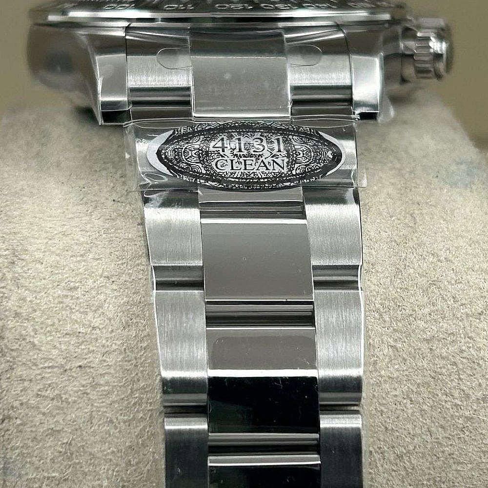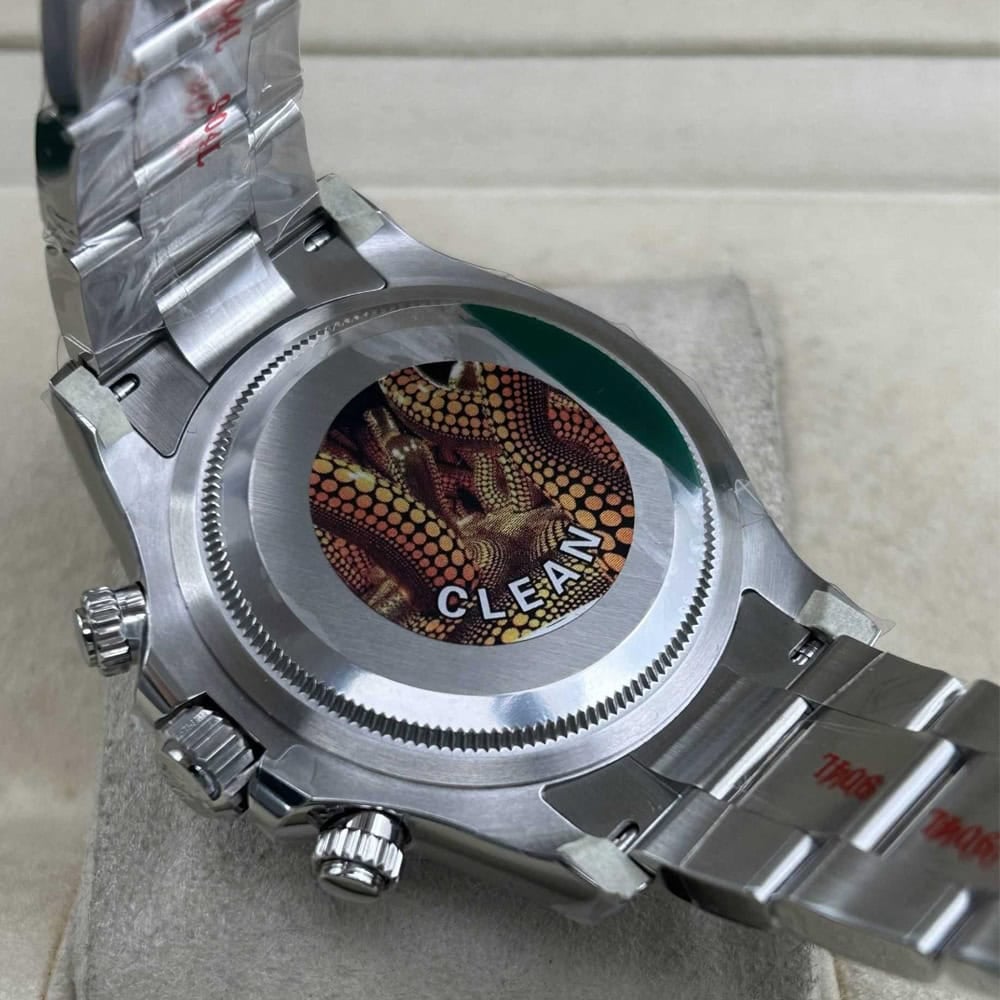 ムーブメント:精緻な技術と数え切れないほどの投資を通じて、クリーンファクトリーは正規品とほぼ同じ11.9ミリの厚さを実現し、長期間にわたる堅牢性と耐久性を保証しています。このムーブメントは28,800 VPH (4Hz)で作動しており、精度も(-4+6秒/日)に抑えられており、パワーリザーブはほぼ48時間に達します。クロノグラフ機能について、スモールセル針と、3時に位置する30分カウンター、9時に位置する12時カウンターを備えており、クリーンファクトリーは卓越性への拘りと時計製造におけるイノベーションを証明しています。