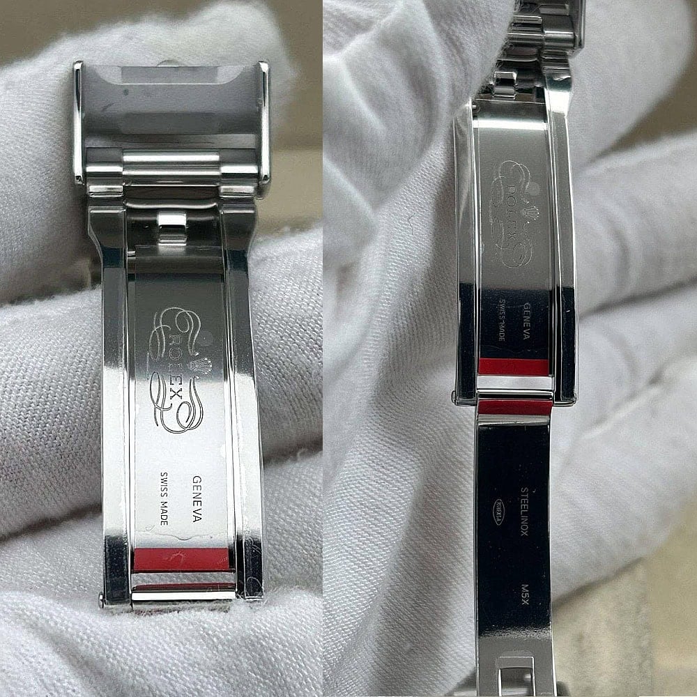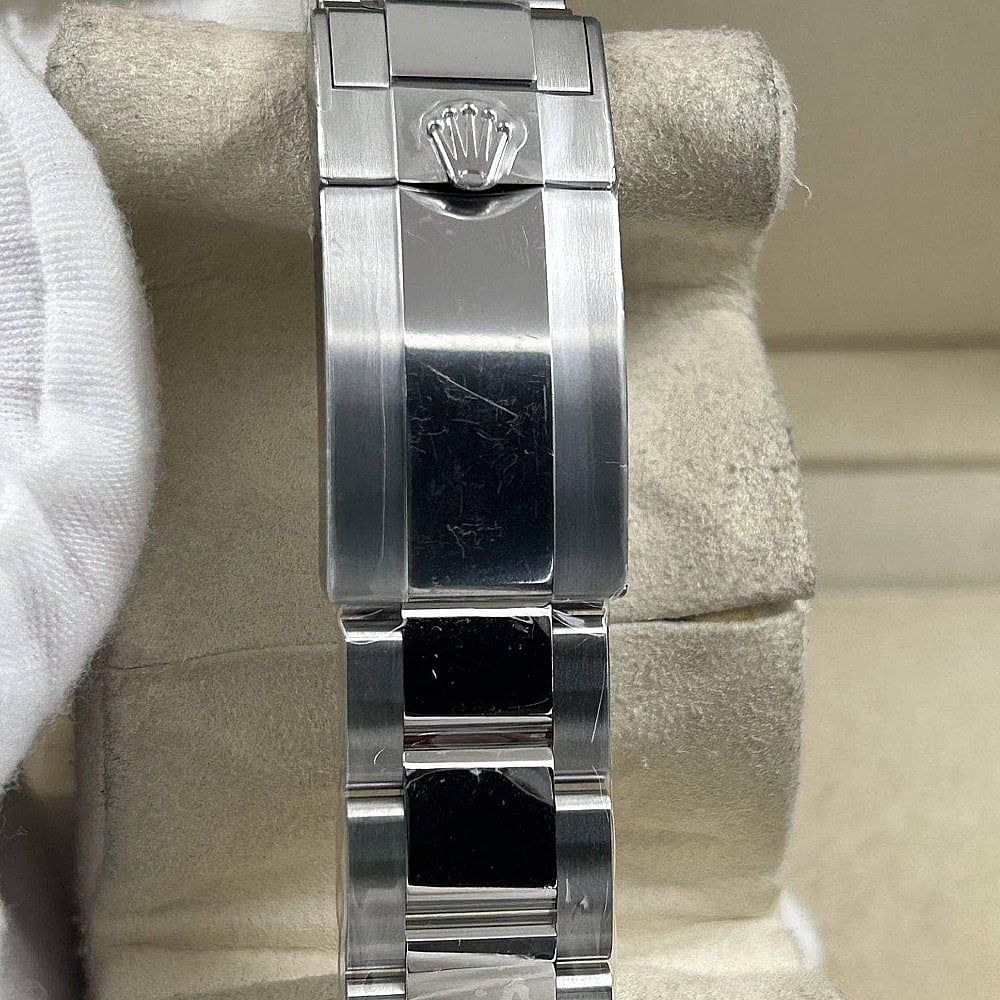 ベルト:3ピースリンクを象徴とするオイスターデザインは快適さとスタイルを提供しています。頑丈な904Lステンレススチールで作り出されており、DLCスクラッチプロティングコーティングを施されており、この時計は長持ちできるように作り出された物です。しっかりしたネジはコマをきちんと固定されており、5ミリコンフォートエクステンションリンク(イージリンクとも言う)を含む折畳式オイスターロック安全スクラップにより素早くベルト調節を実現します。