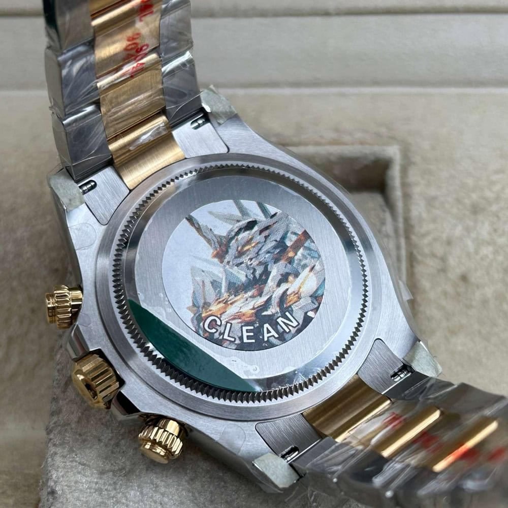 ケース:クリーンファクトリーは40ミリケースを備えており、18Kイエローゴールド加工を施されたソリッド904Lステンレススチールは本物ロレックススチールのモノブロック構造に似ています。スクリュー式ケースバックとプッシュボタン、巻き上げリューズは合成ラバーで密封されており、時計の防水性を確保しています。時計のRehautリンクには‘ROLEXROLEXレザー刻印があり、DLCスクラッチプロティングコーティングを施されております。すべての寸法はロレックス正規品と同一であり、すべての部品をオリジナルと交換できることが保証されています。