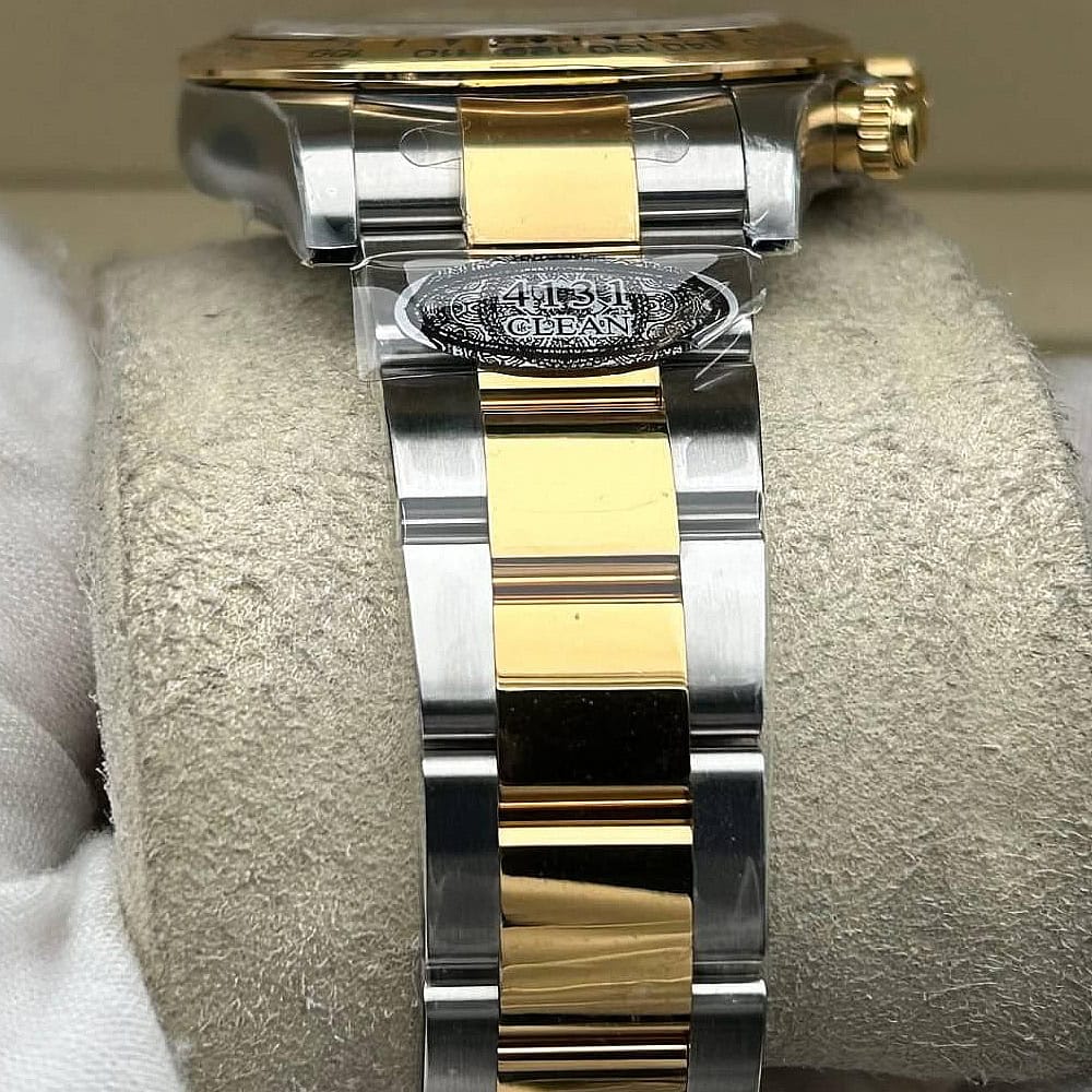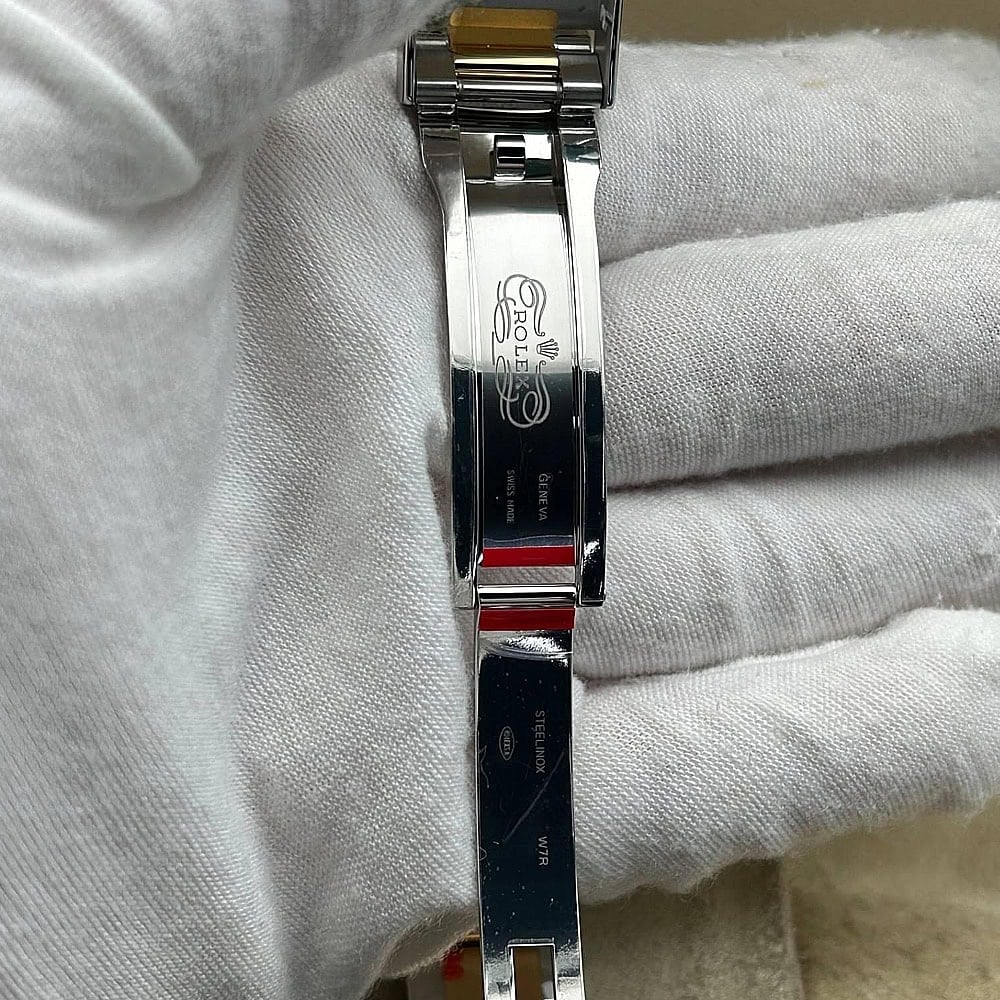 ベルト:ベルトは平たい3ピースリンクを象徴とするクラシックなオイスターデザインを採用されており、18Kイエローゴールドコーティングされた904Lステンレススチールで作り出されており、DLCスクラッチプロティングコーティングも施されています。ベルトはしっかりとしたネジ山と5 mm コンフォート エクステンション リンク(イージリンクとも言う)を備えた折りたたみ式オイスターロック安全クラスプを含まれています。